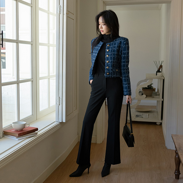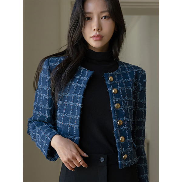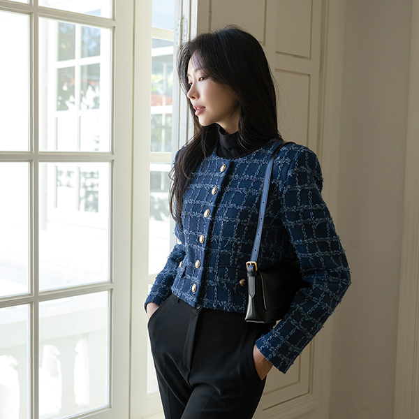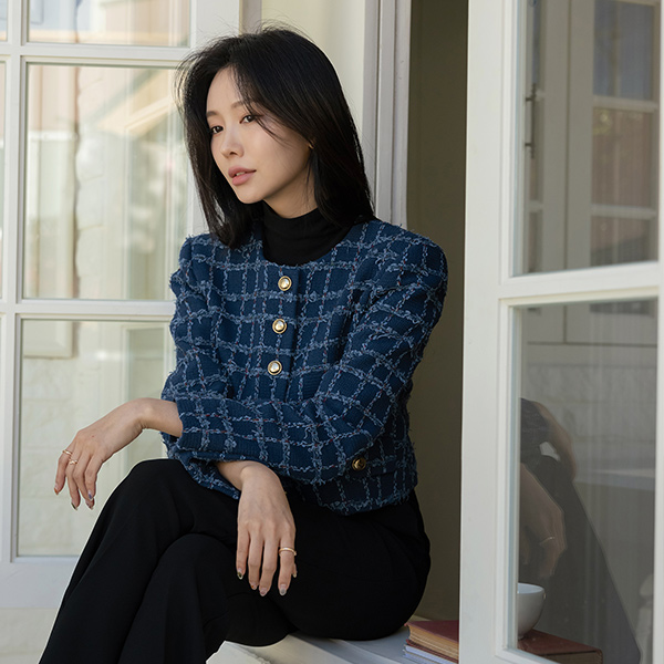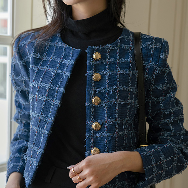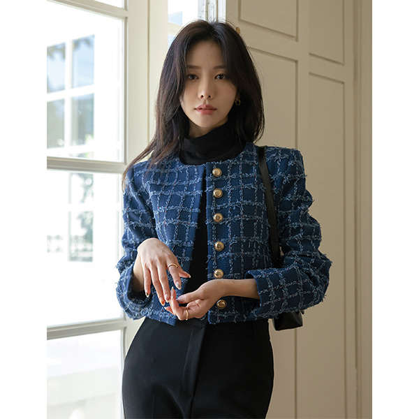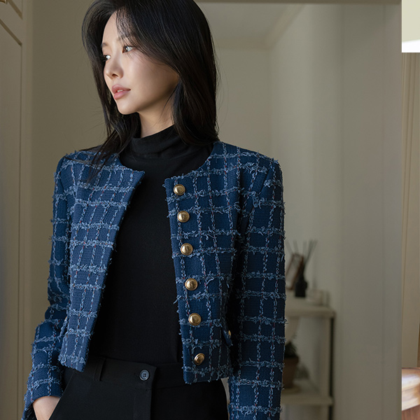 格子 粗呢 黄金 扣子 7分裤 夹克
