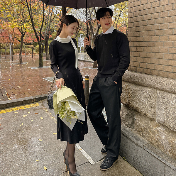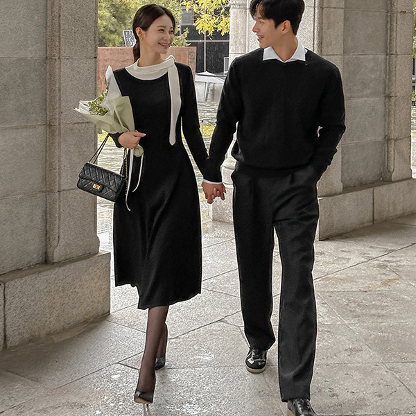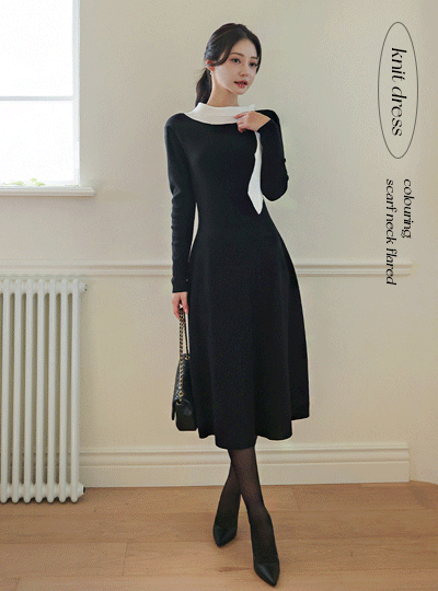 配色 围巾领 喇叭 长款 针织衫 连衣裙