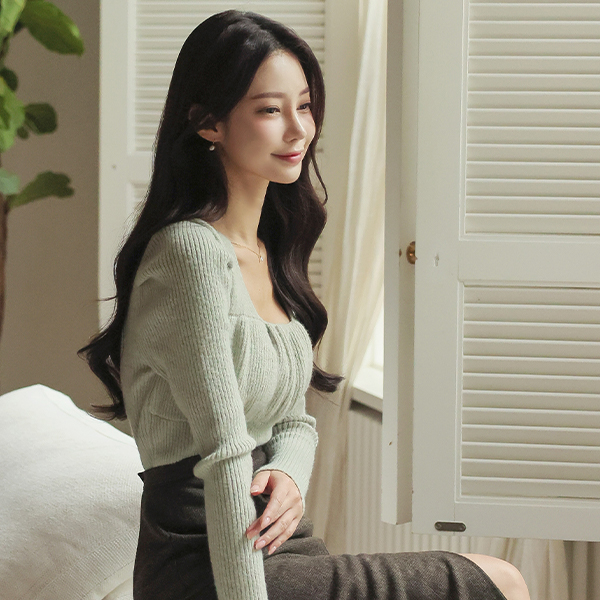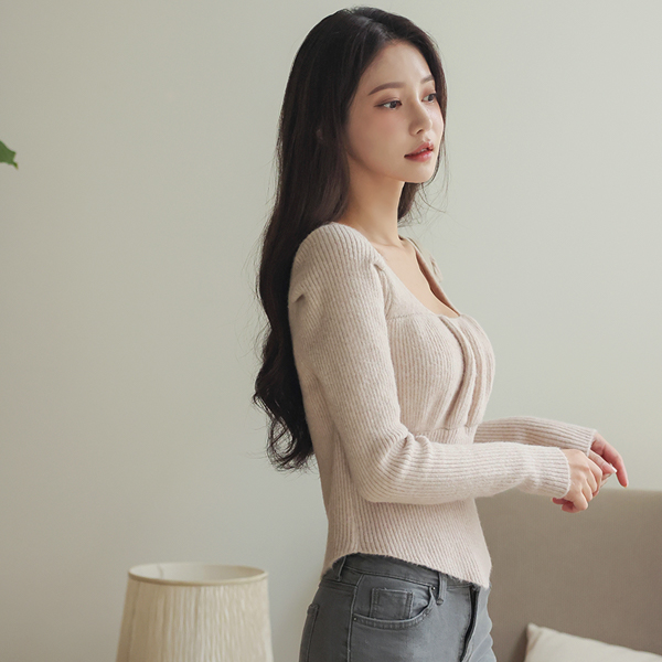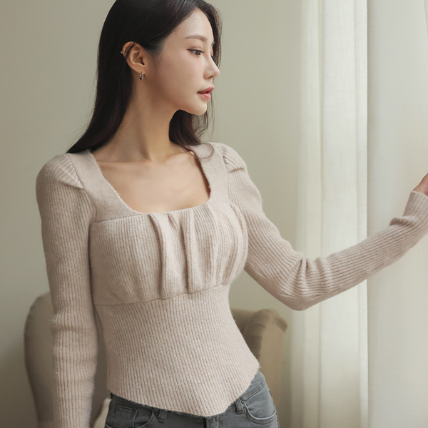 蓬松。 深 方领 褶皱 泡泡袖 袖 不规则 针织衫