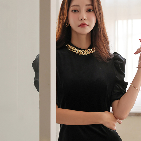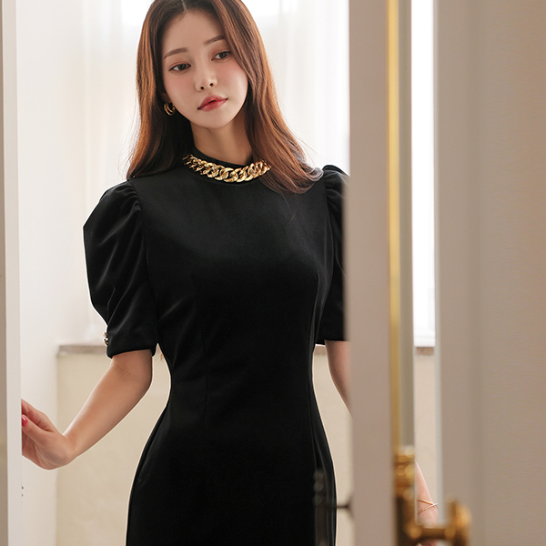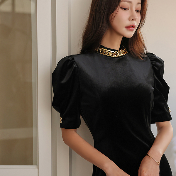 丝绒 粗 黄金 체인넥 泡泡袖 袖 连衣裙 (2type)