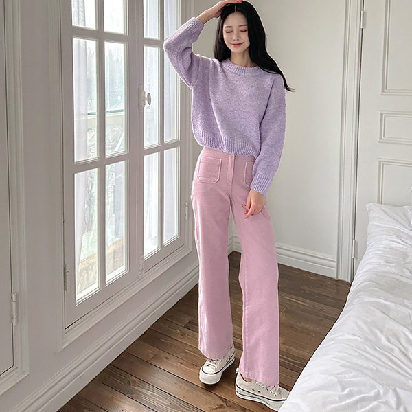 柔色 灯芯绒 口袋 点缀 后腰松紧带 直筒 裤子