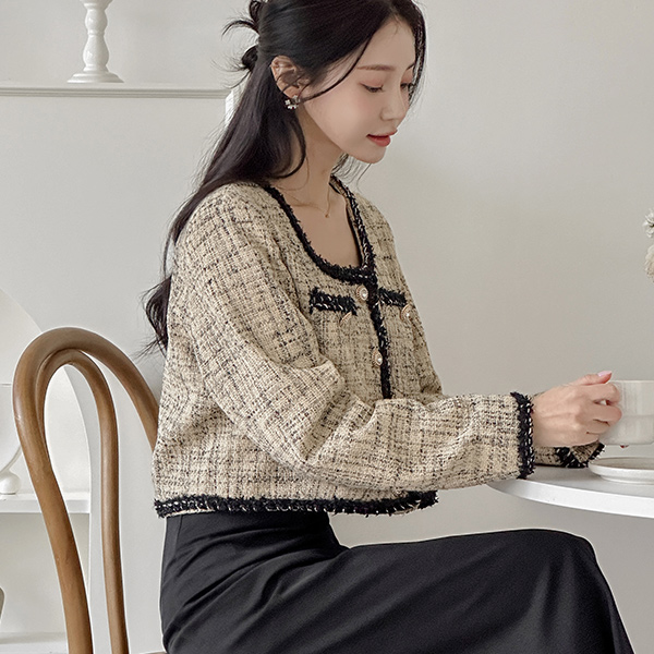 深 方领 宝石 扣子 粗呢 夹克