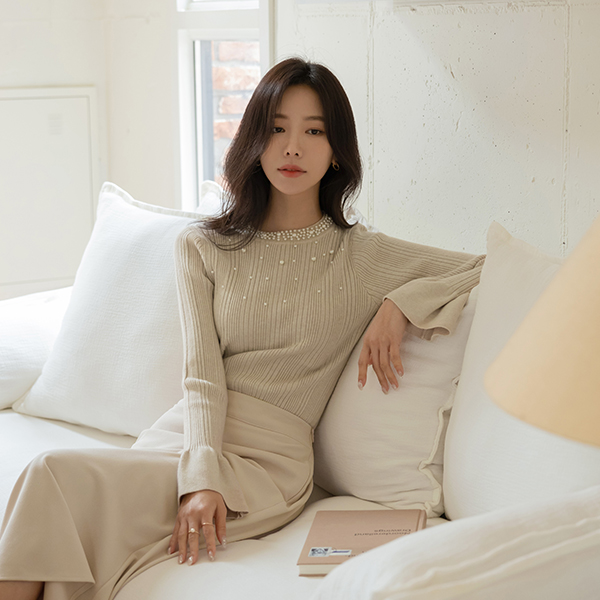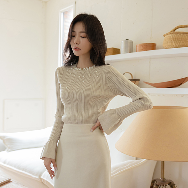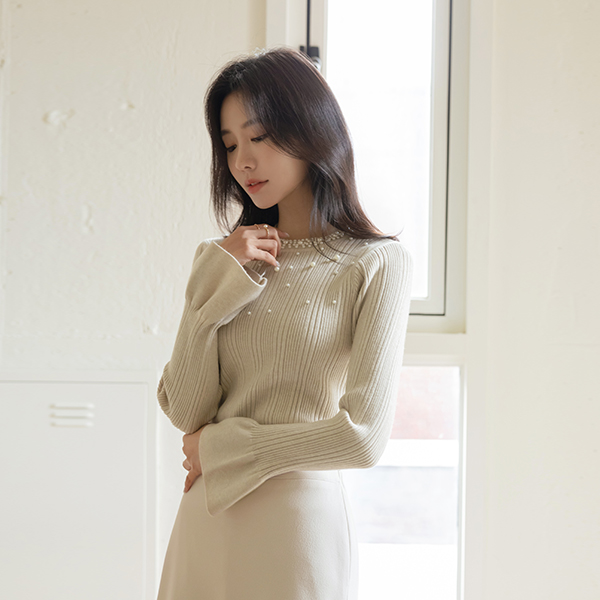 极光 珍珠 装饰 荷叶 袖 斯利姆 条绒 针织衫
