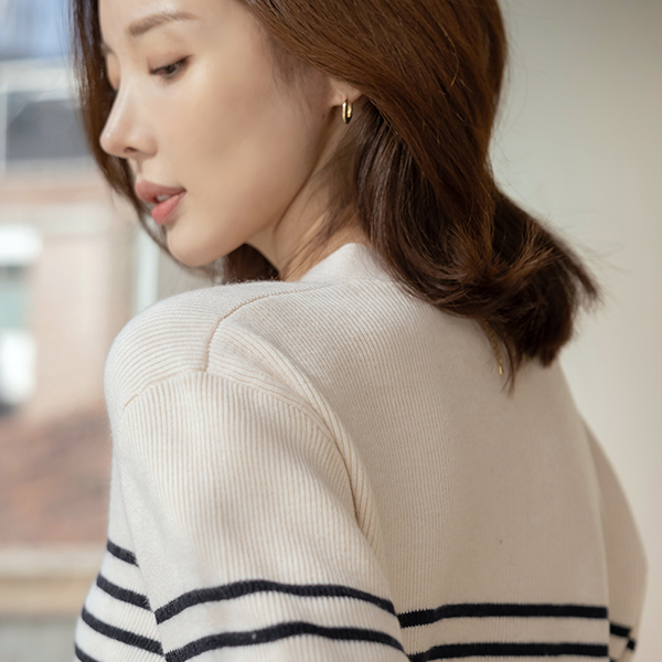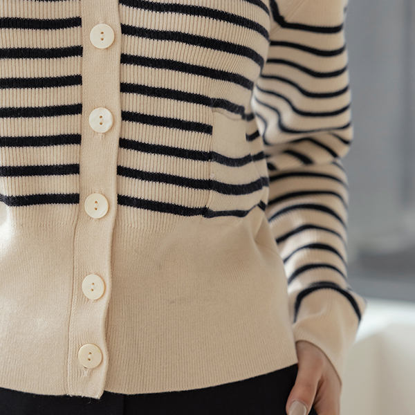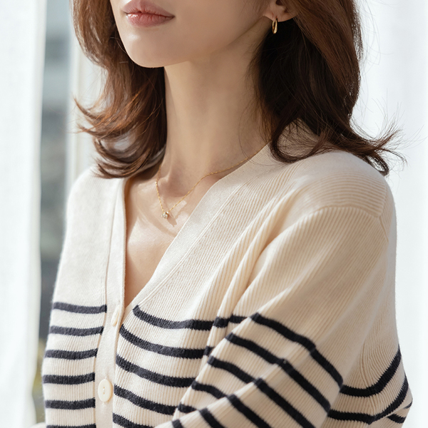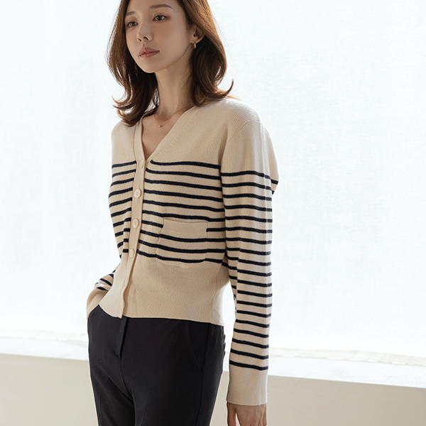 V字领 条纹 口袋 羊毛 开衫