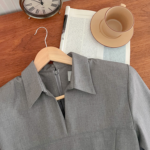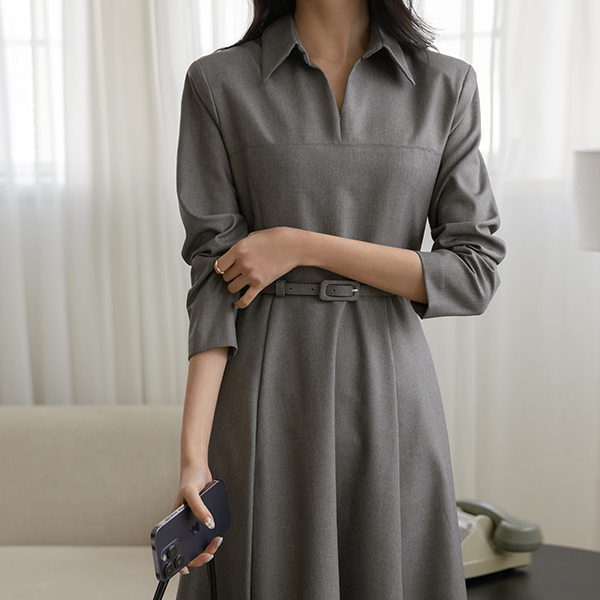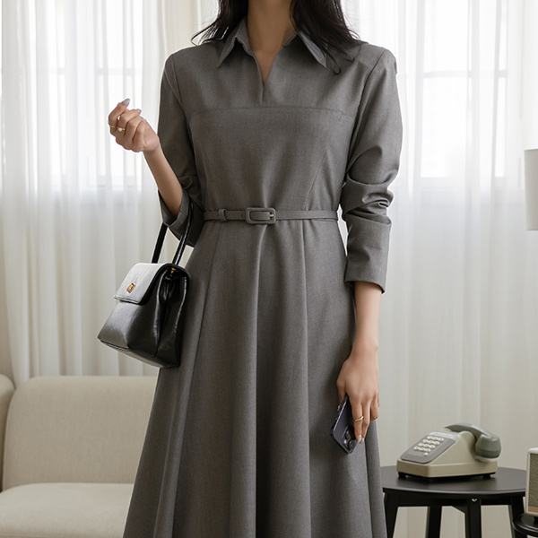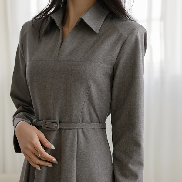 肩膀 垫 翻领 A字型 连衣裙 (腰带SET)