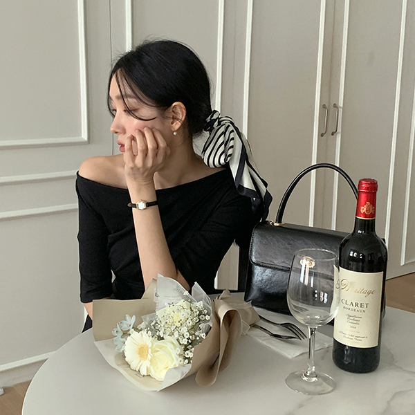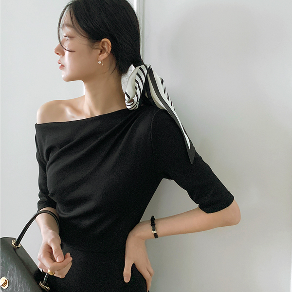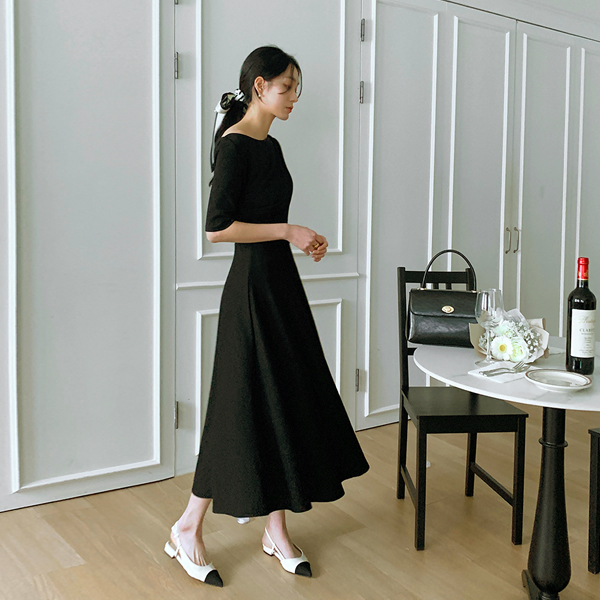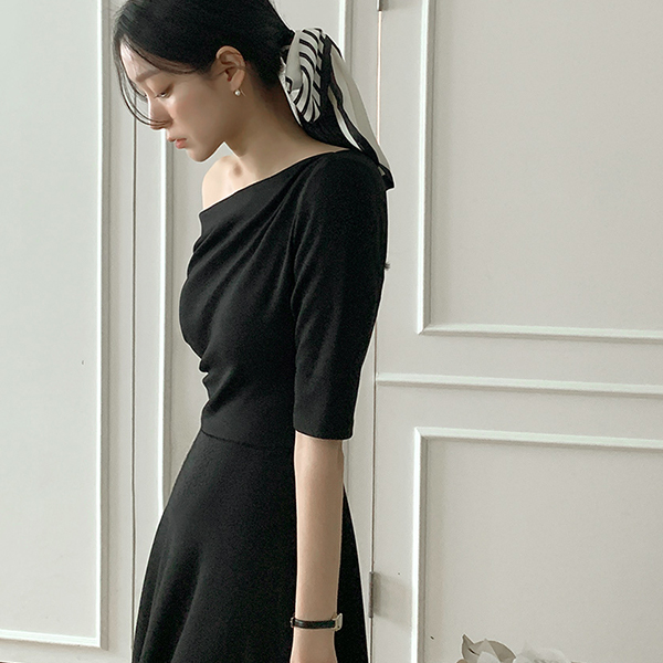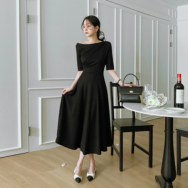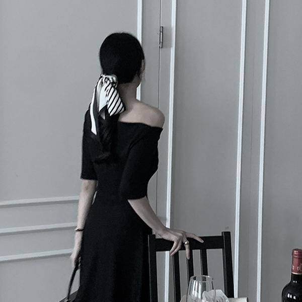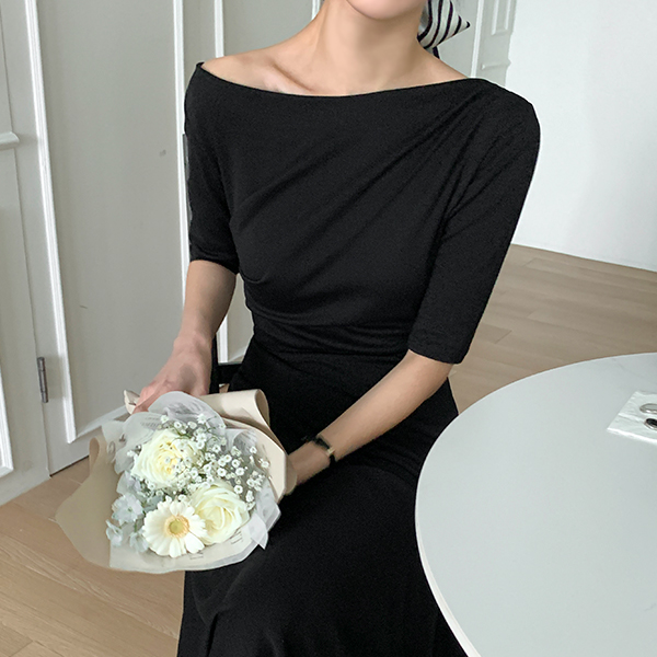 不规则 褶皱 露肩 弹力 喇叭 长款 连衣裙