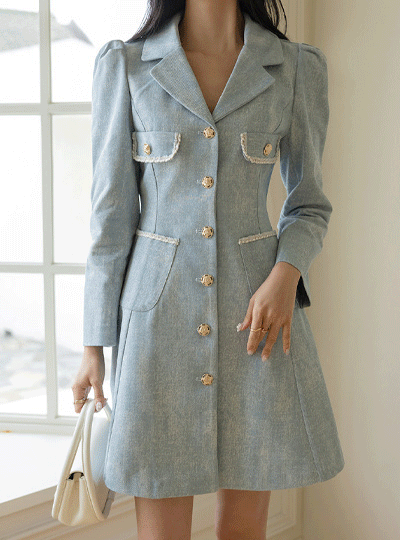 春季 泡泡袖 A字型 牛仔色 连衣裙