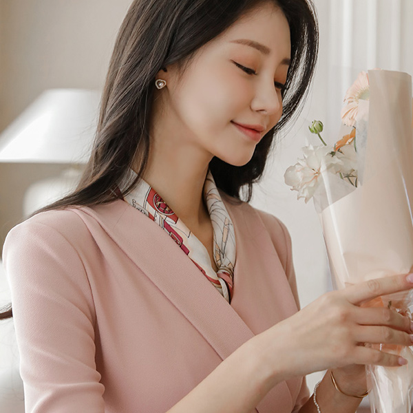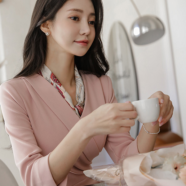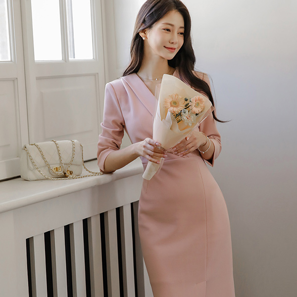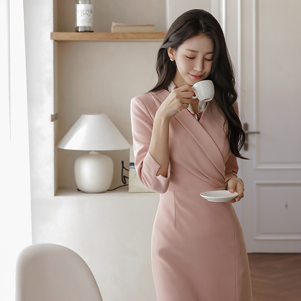 폴딩넥 裹身 侧纽 褶皱 7分袖 开衩 弹力 连衣裙