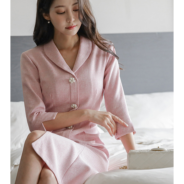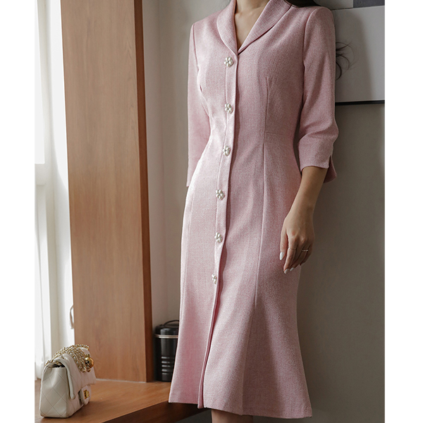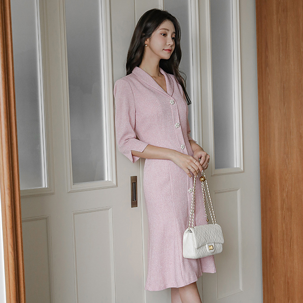 粗呢 披巾领 花纹 珍珠 扣子 美人鱼 连衣裙