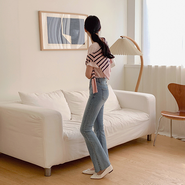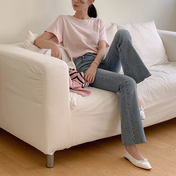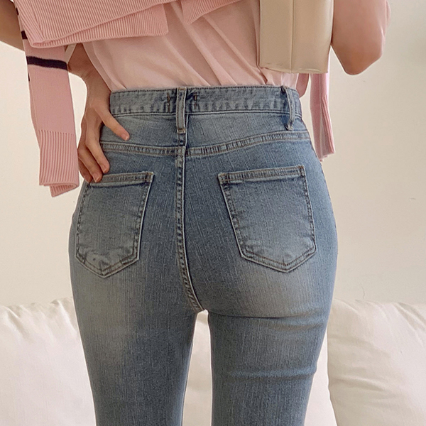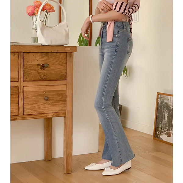 两扣 底端 裁剪 斯利姆 喇叭 牛仔色 裤子