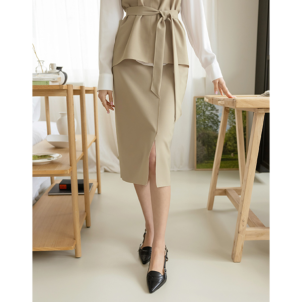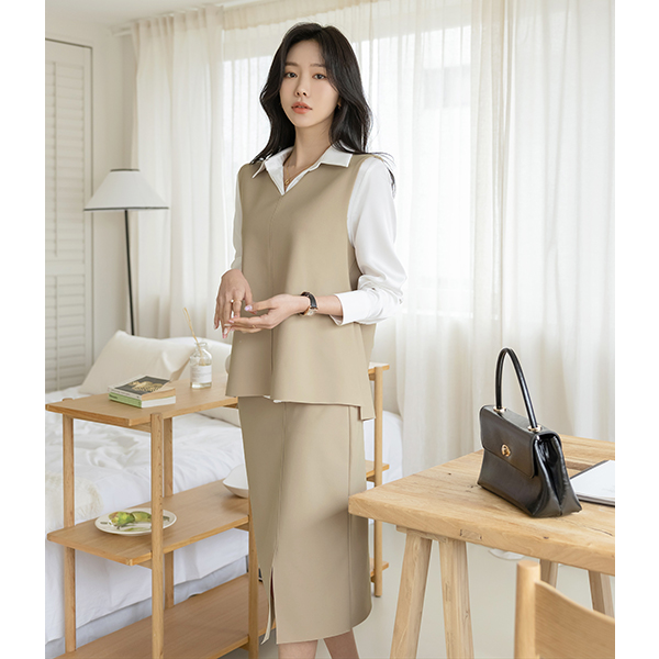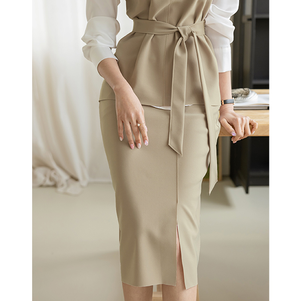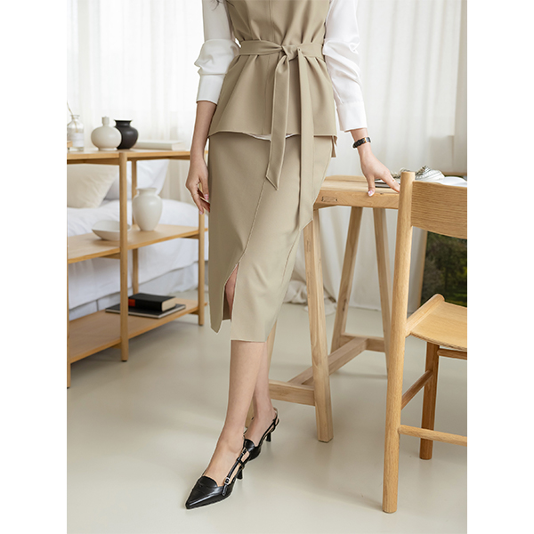 그레타 V字领 细密 马甲 罩衫 (腰带SET)