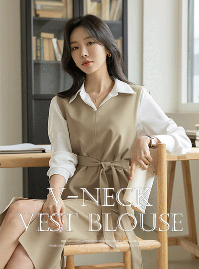 그레타 V字领 细密 马甲 罩衫 (腰带SET)