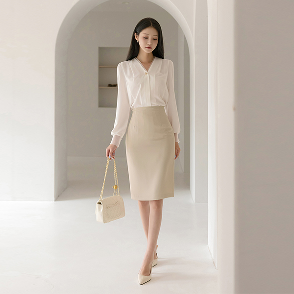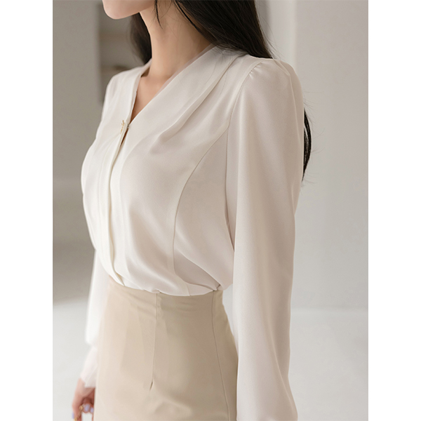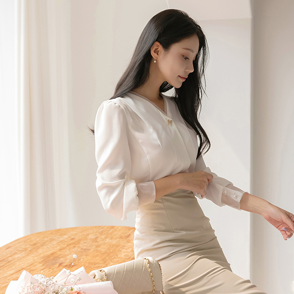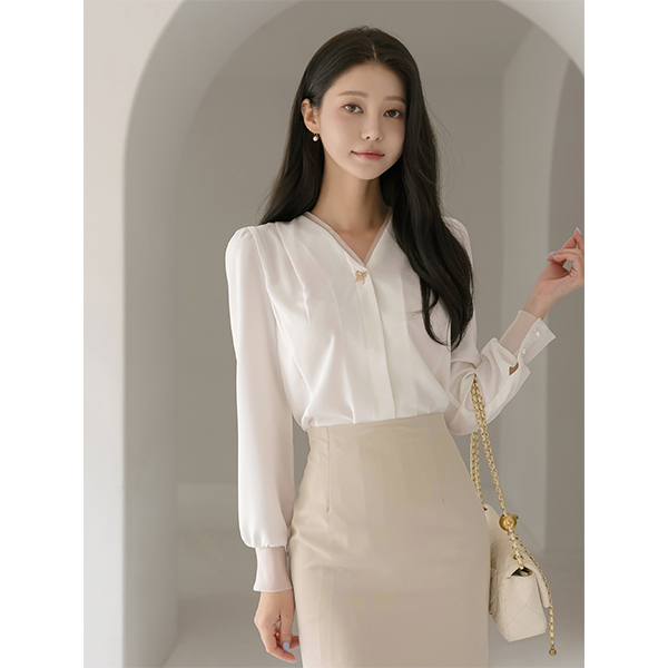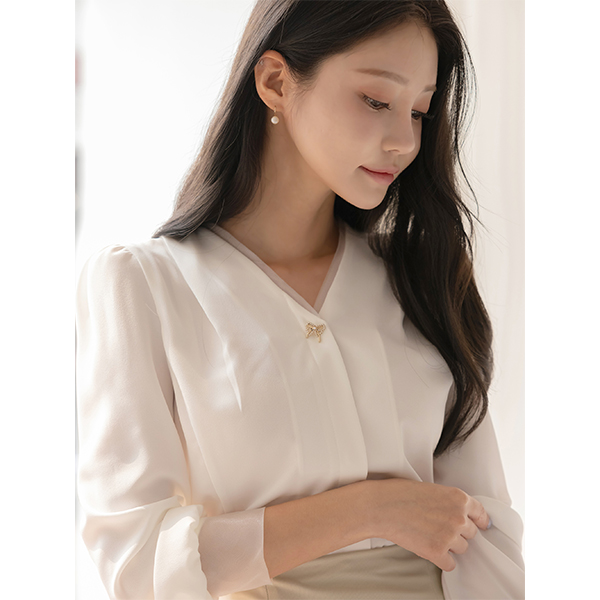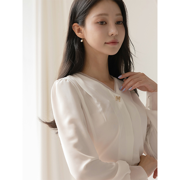 V字领 透明硬纱 衬里 蝴蝶结 扣子 罩衫