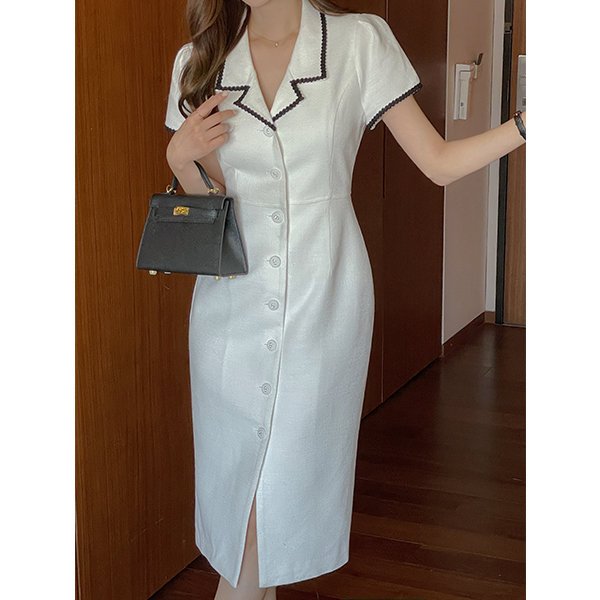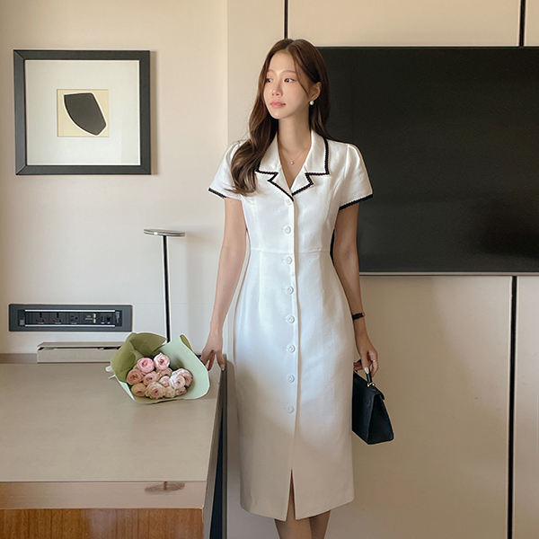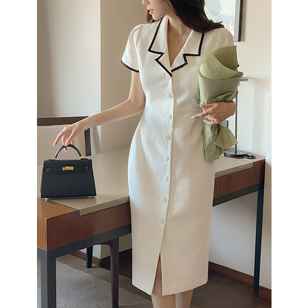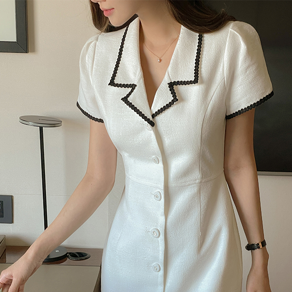 이브 带子 线条 配色 领子 粗呢 连衣裙