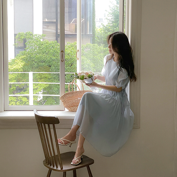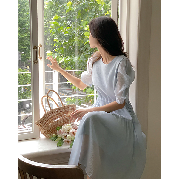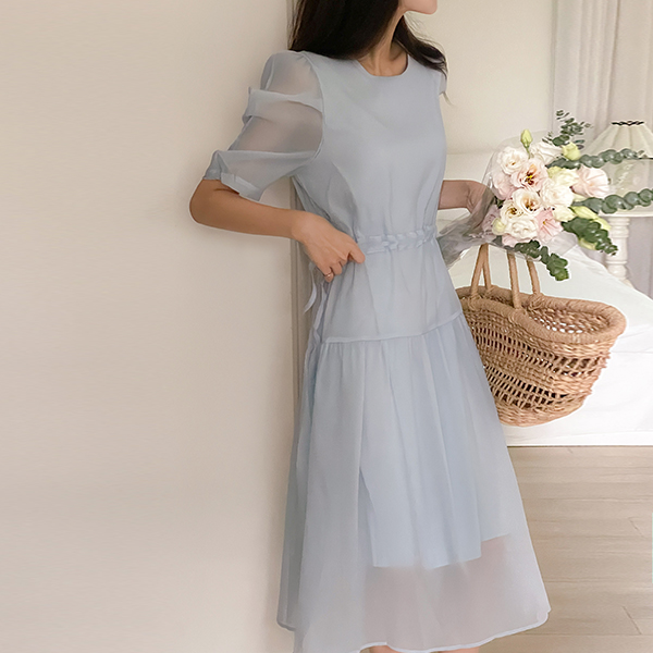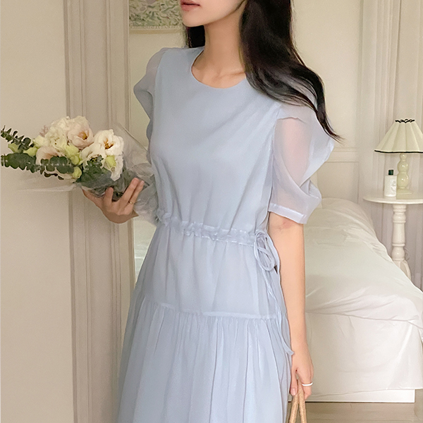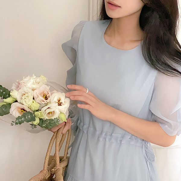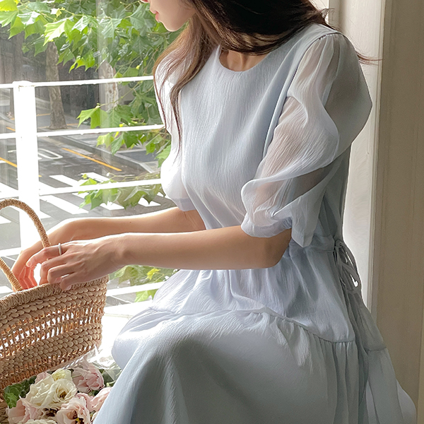 透视 泡泡袖 抽绳 荷叶裙 连衣裙