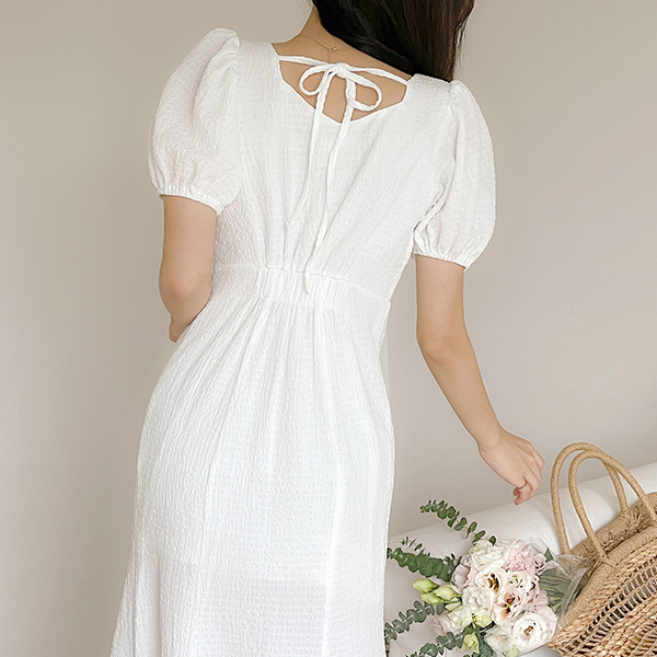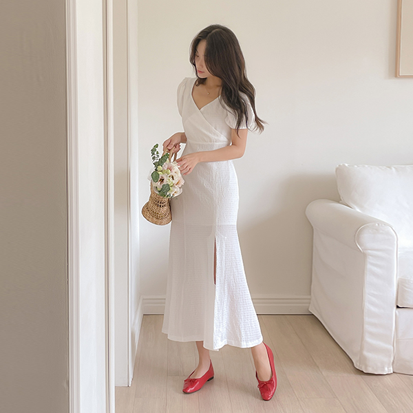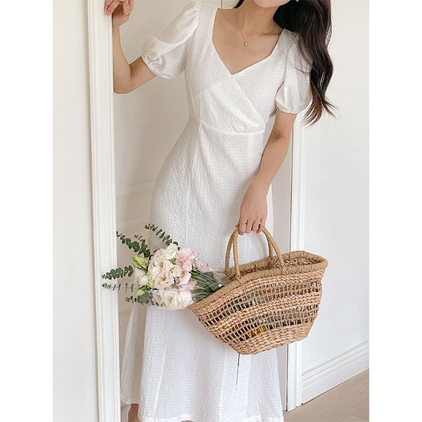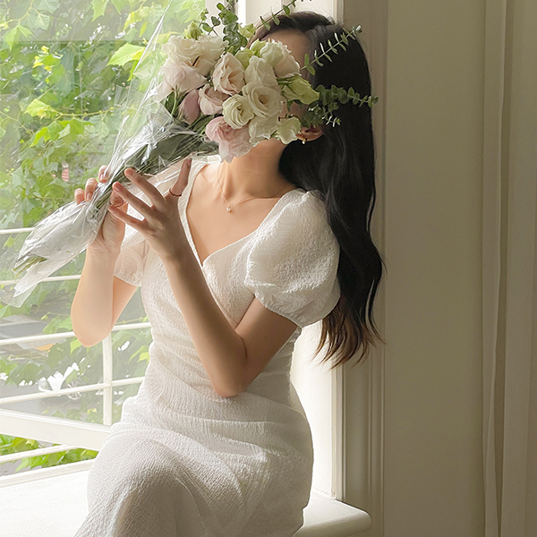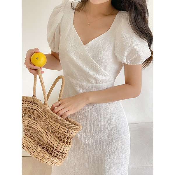去皱纹 泡泡袖 美人鱼 后侧松紧带 弹力 连衣裙