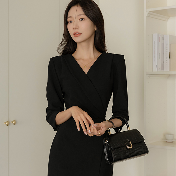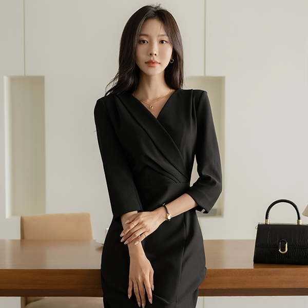 폴딩넥 裹身 侧纽 褶皱 7分袖 开衩 弹力 连衣裙 Ⅱ