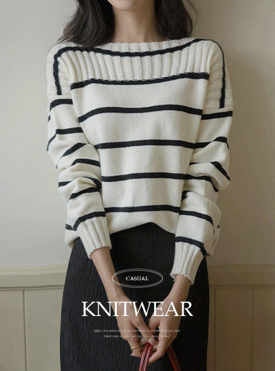 苗条 船形领 横条纹 图案 针织衫