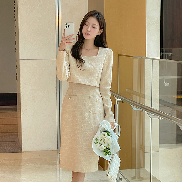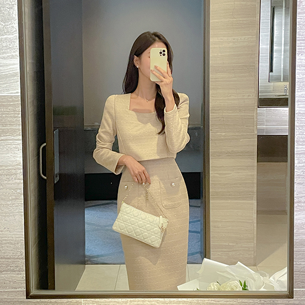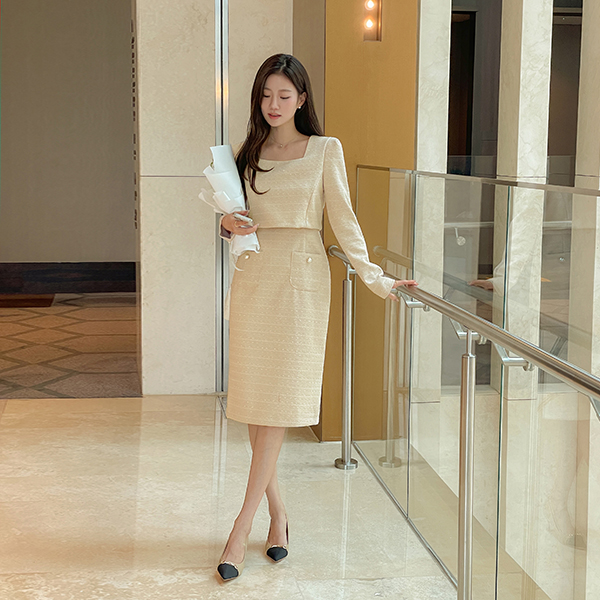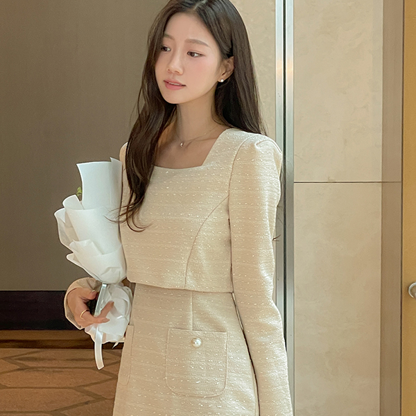 쥬리 珍珠 两件套 风格 粗呢 连衣裙
