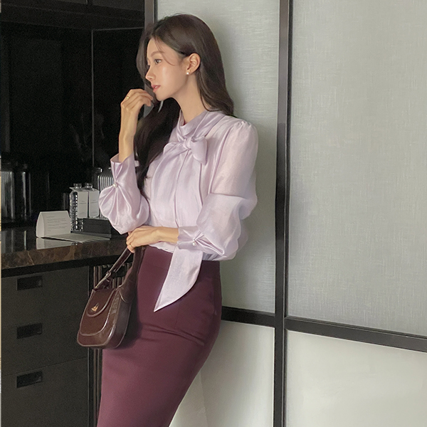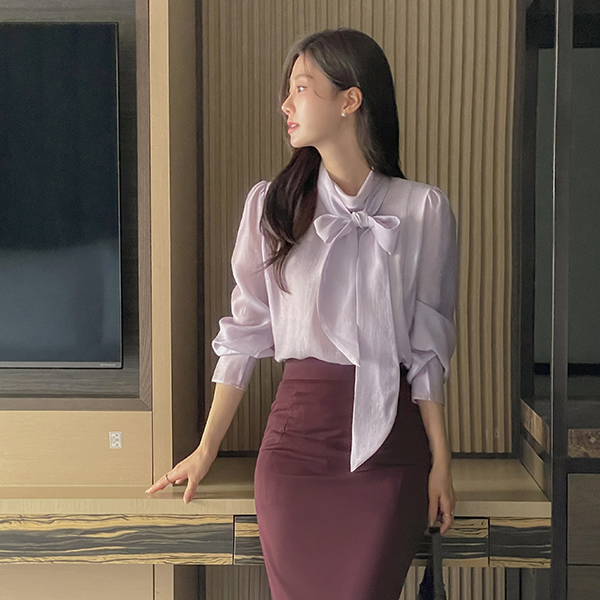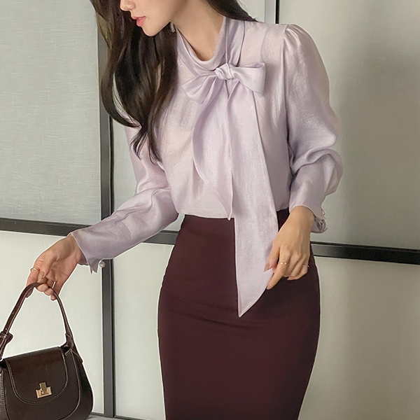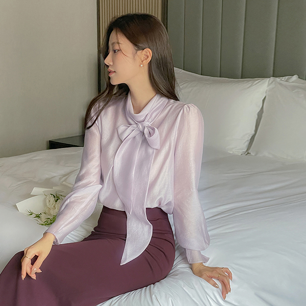 优雅 蝴蝶结 半高领 珍珠 袖 罩衫