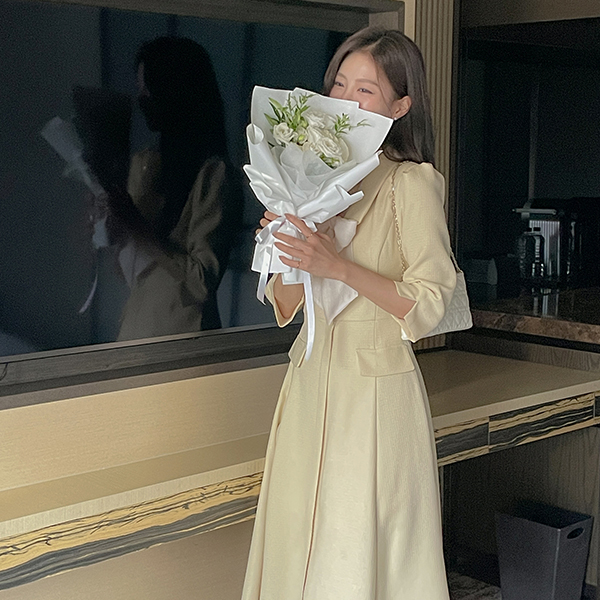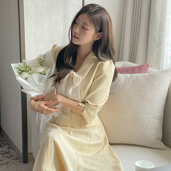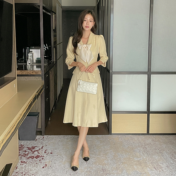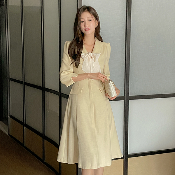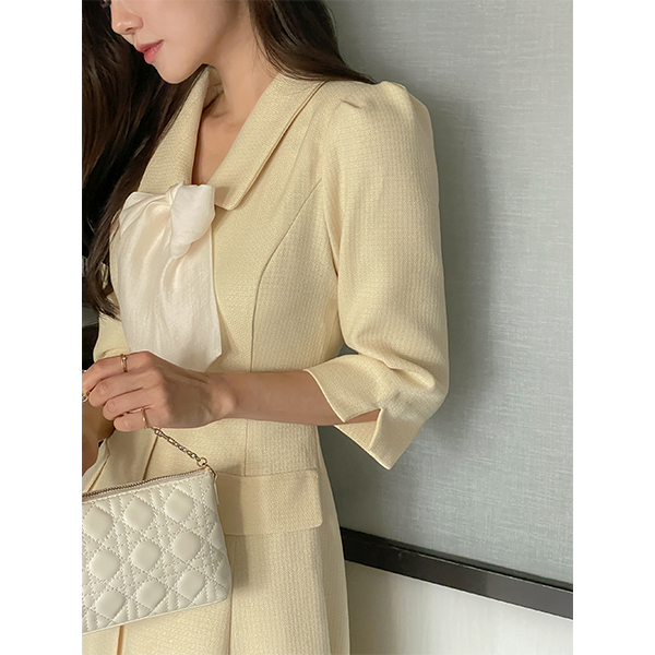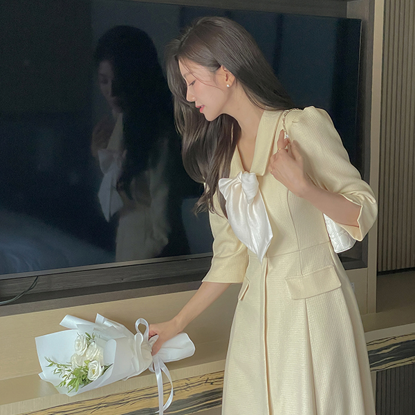 配色 蝴蝶结 A字型 粗呢 连衣裙