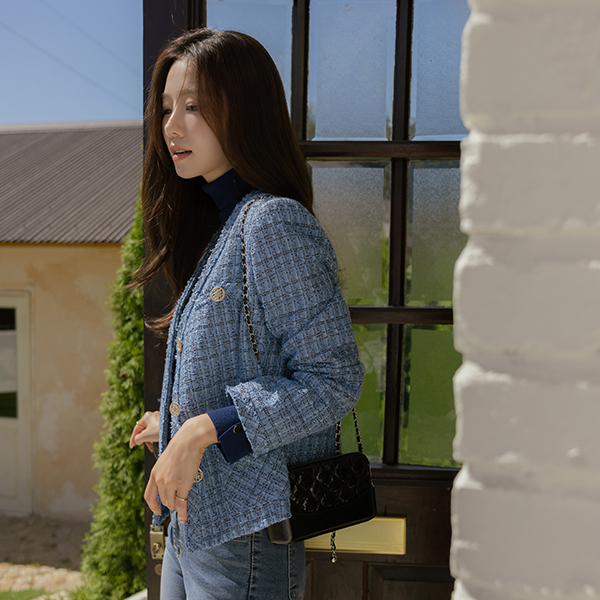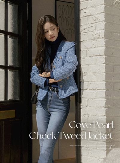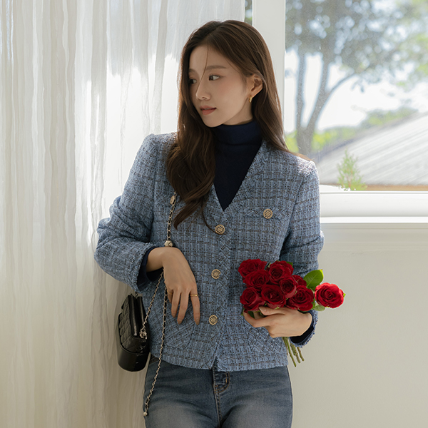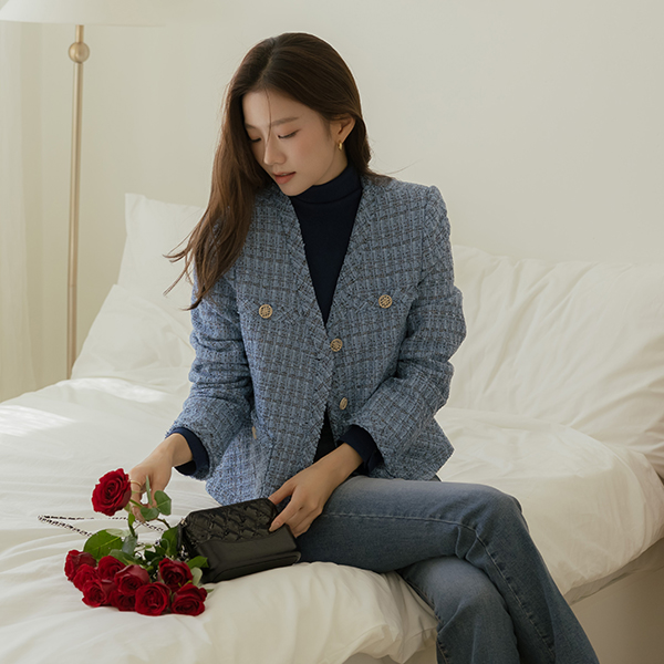 코브 珍珠 格子 V领 粗呢 夹克