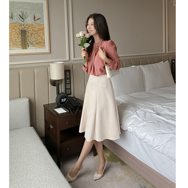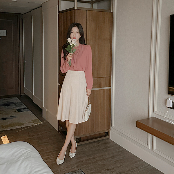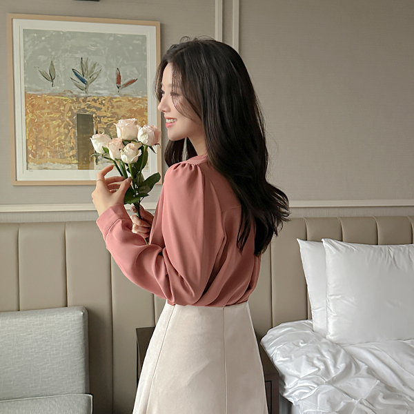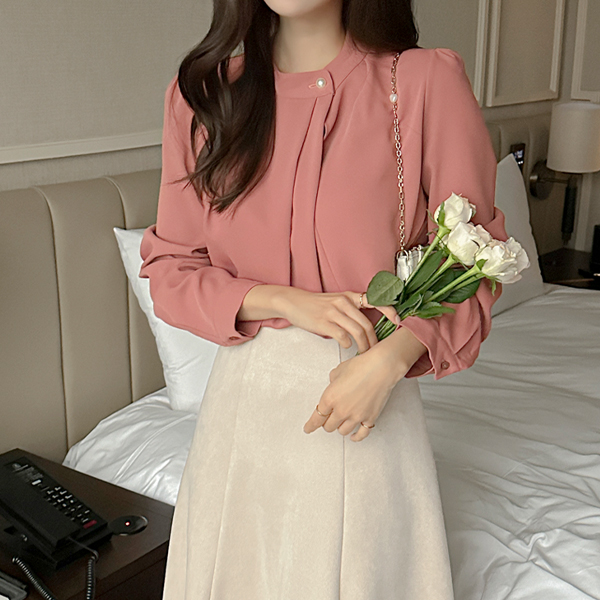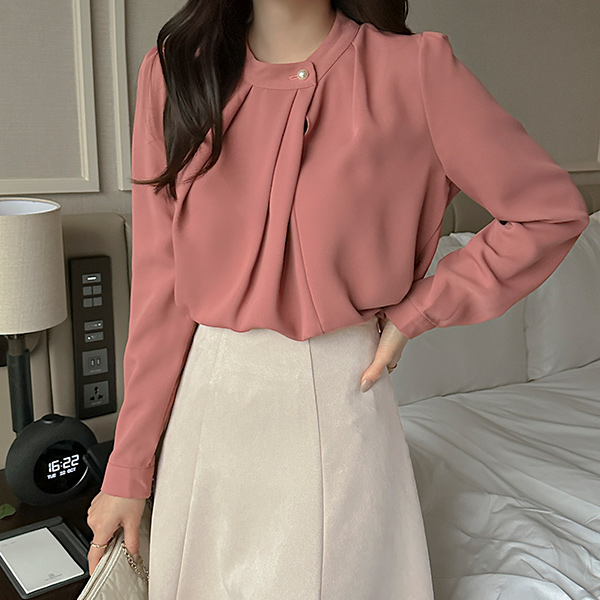 大红色 珍珠 탑버튼 细褶 罩衫