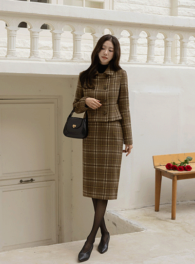 柔软的 羊毛 格子 H字型 Set-up 裙子
