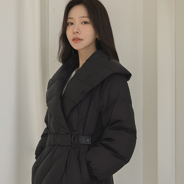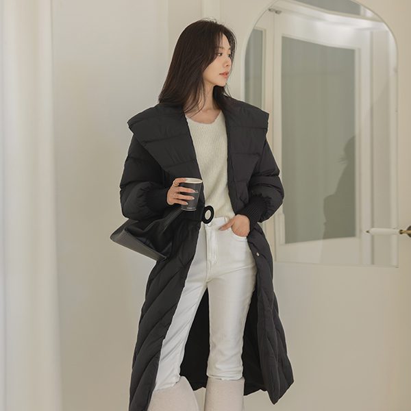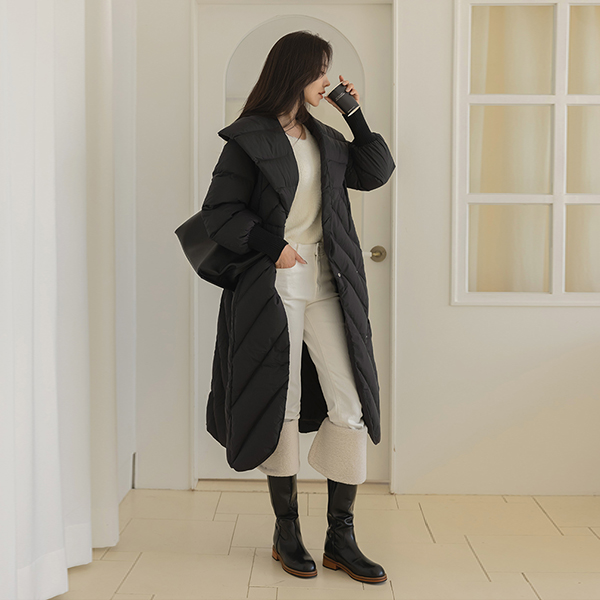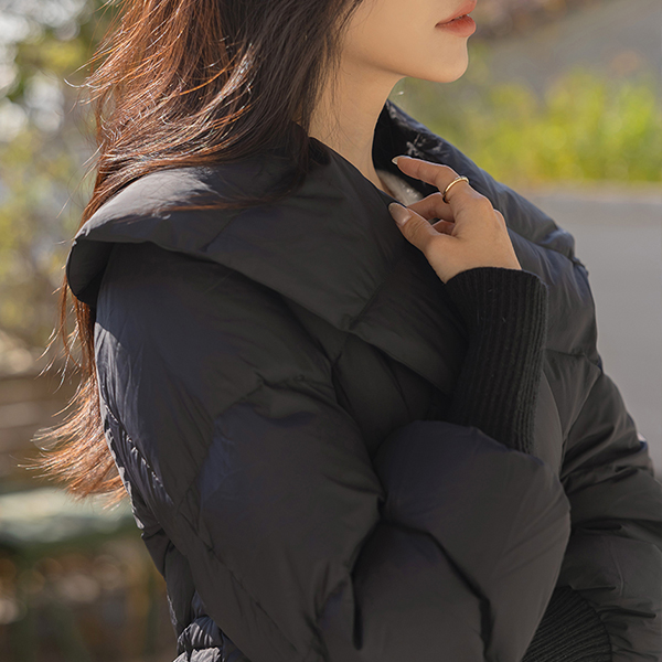 鸭绒100% 宽松 披巾领 束带 长款羽绒服