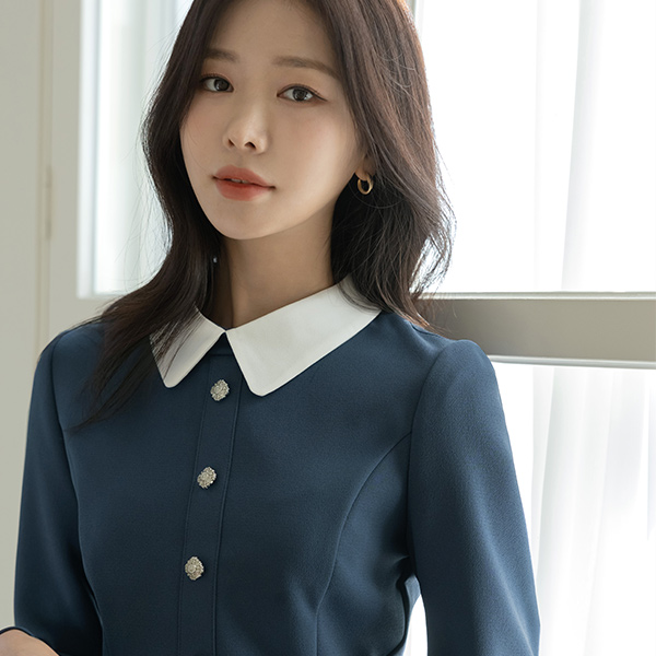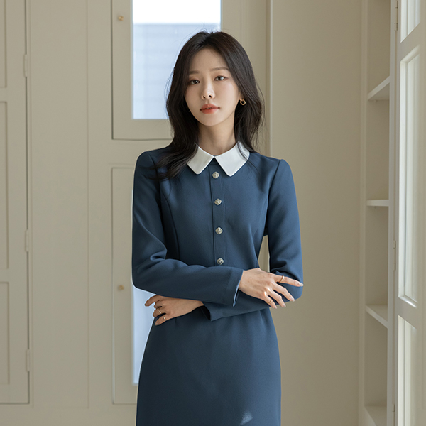 단아 配色 领子 细密 斯利姆 连衣裙