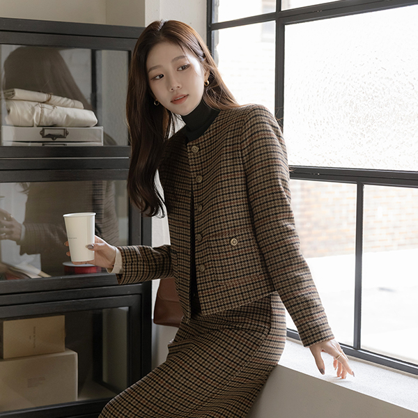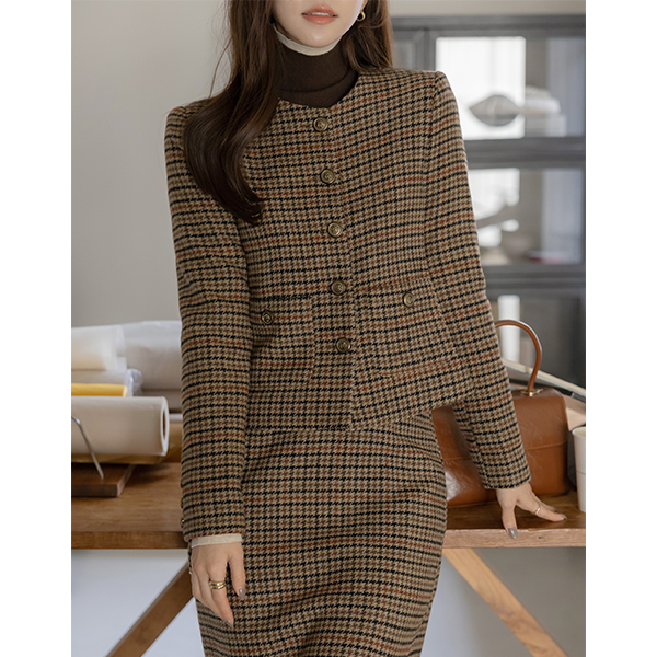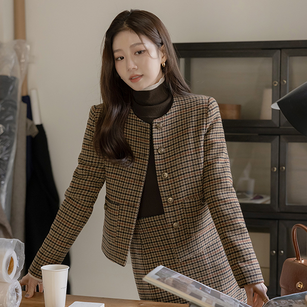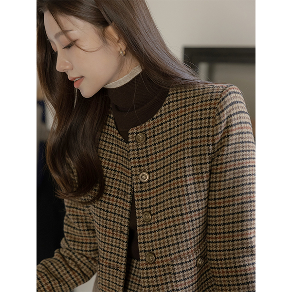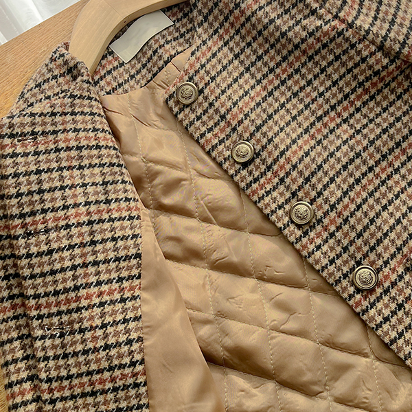 犬牙 格子 圆领 羊毛 棉衣 Set-up 夹克