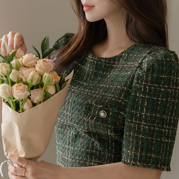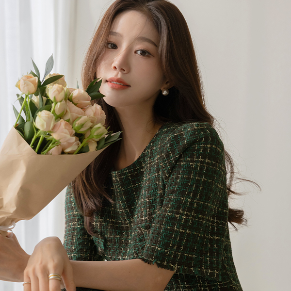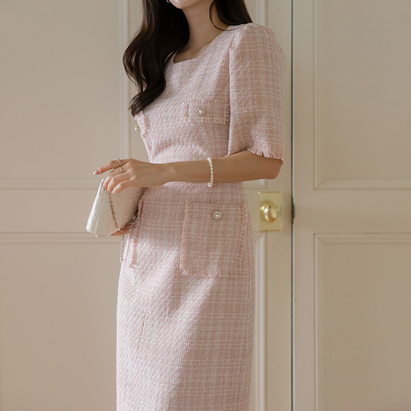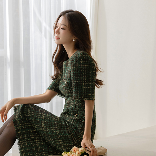 금사 羊毛 混合 粗呢 短袖 连衣裙