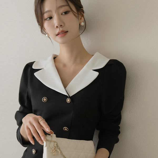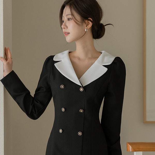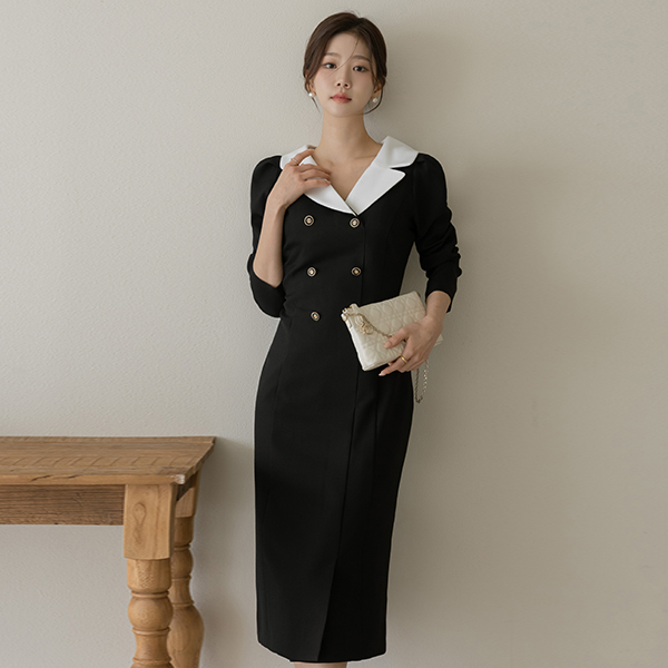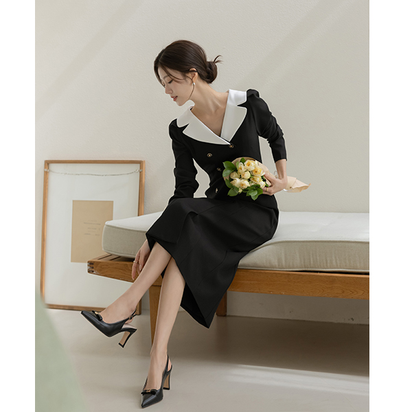 베네 翻领 双 扣子 H字型 连衣裙