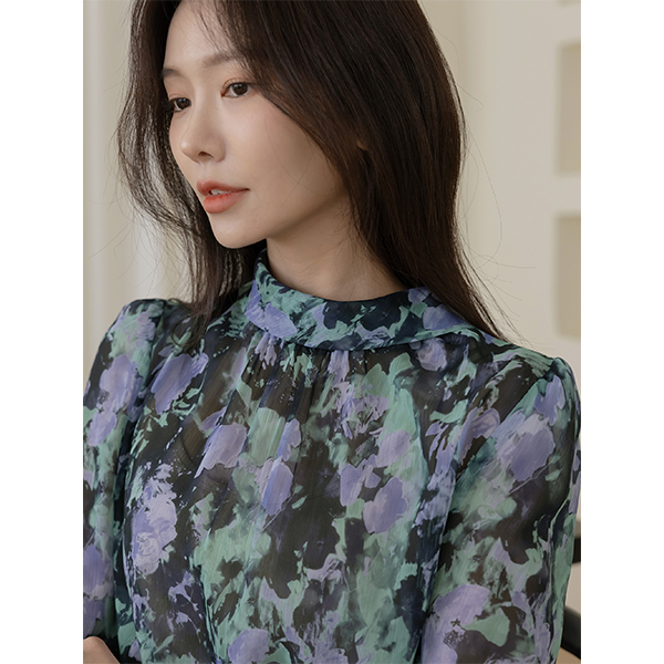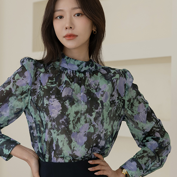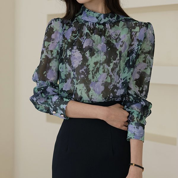 花纹 软绵绵软的 半高领 雪纺 罩衫