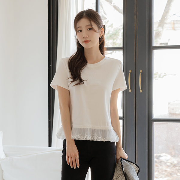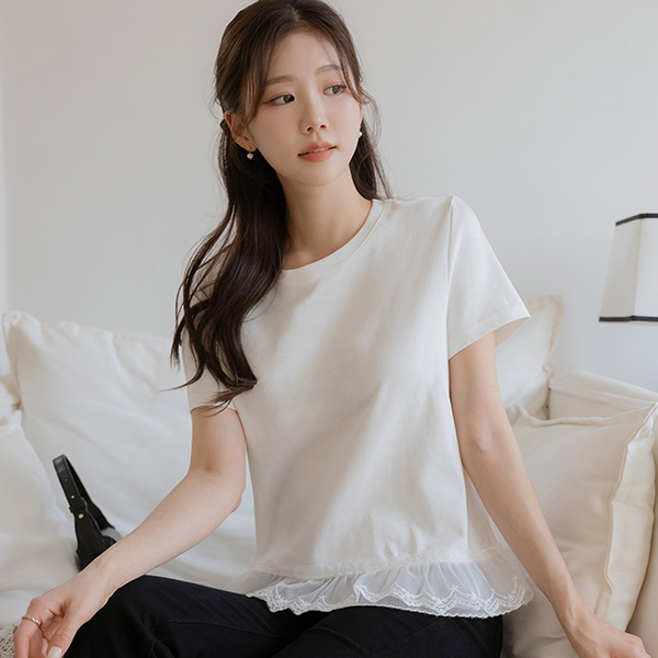 可爱 底端 蕾丝 短袖 棉 T恤衫
