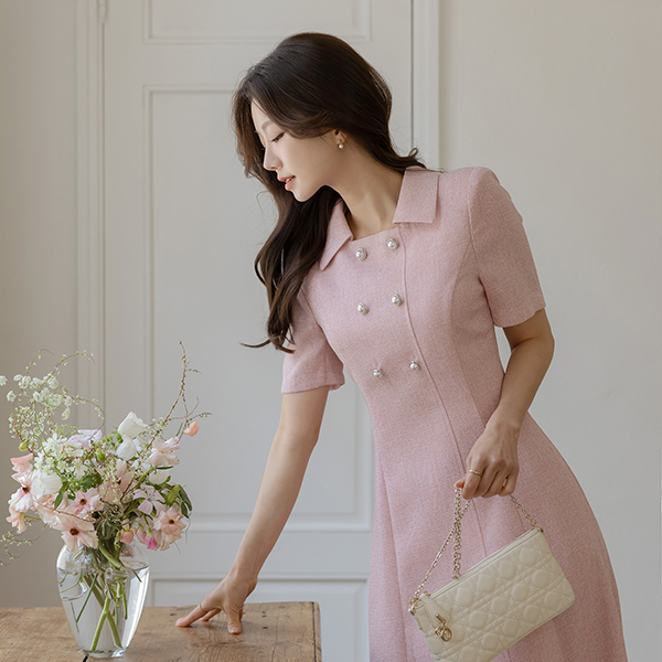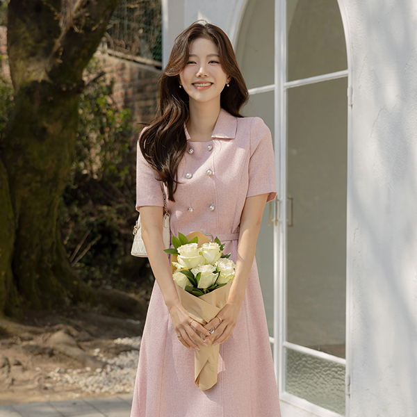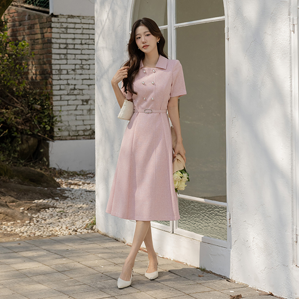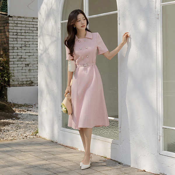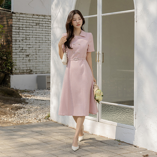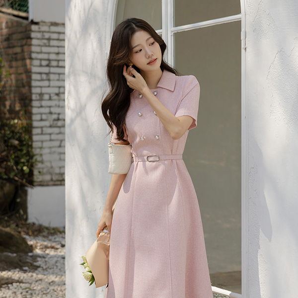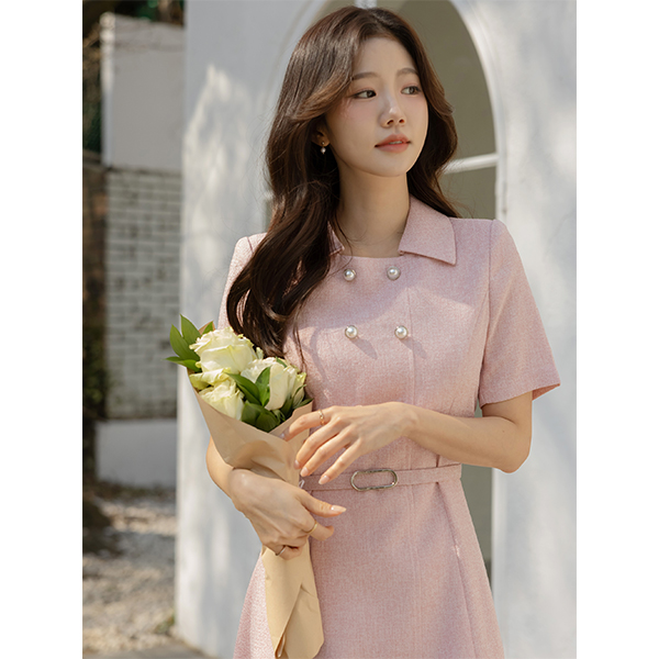双 珍珠 领子 A字型 粗呢 连衣裙(+腰带)