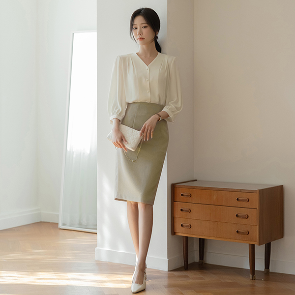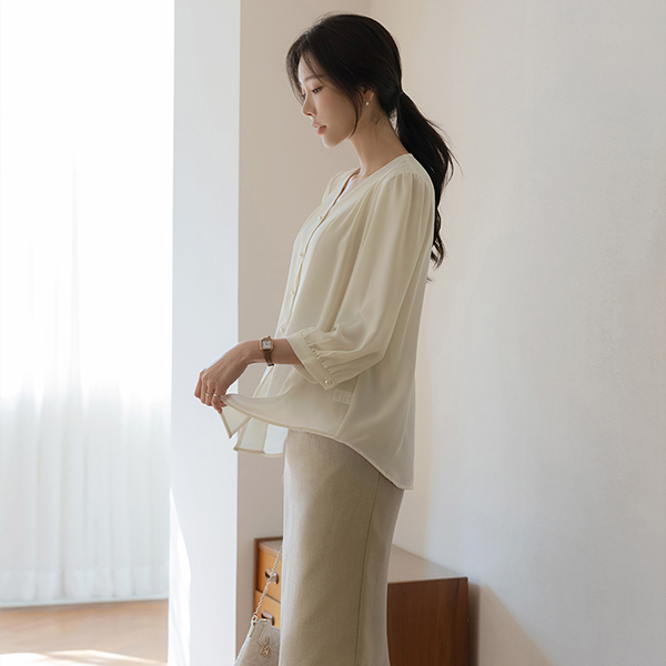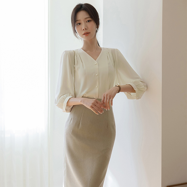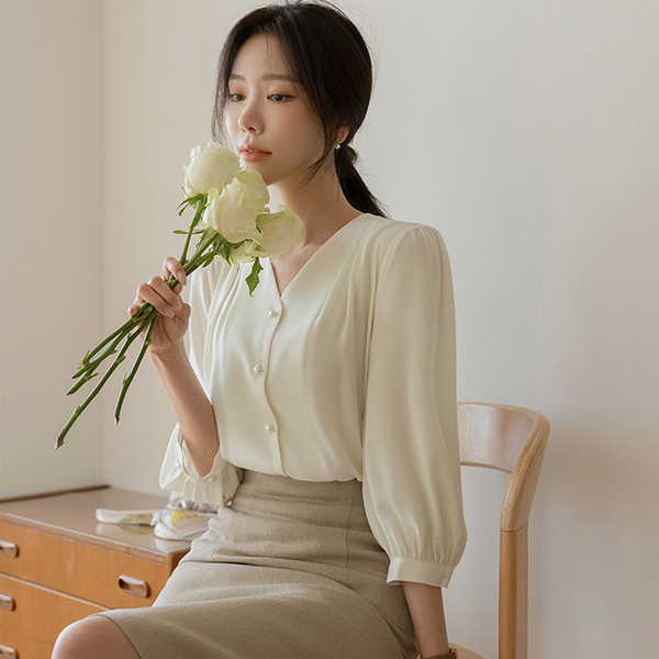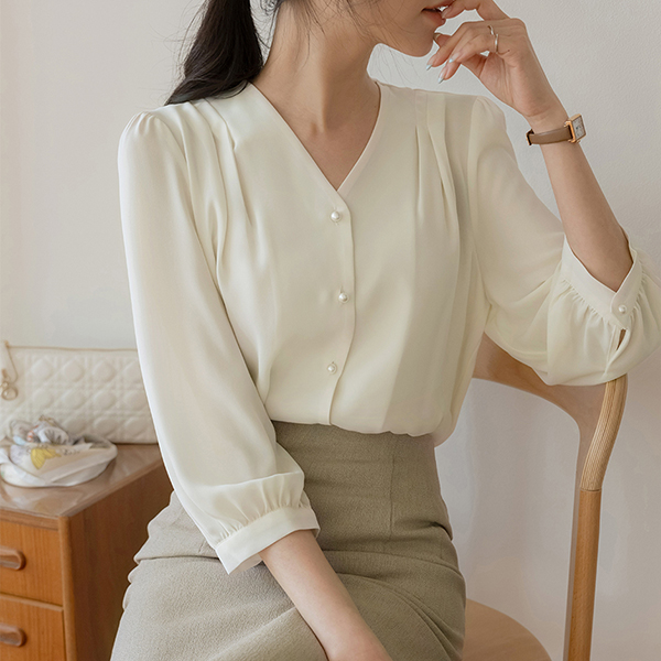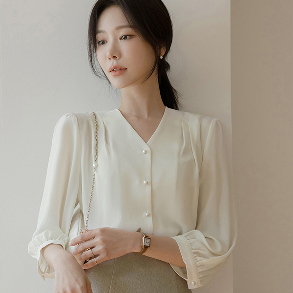 글라비 细褶 V字领 珍珠 罩衫