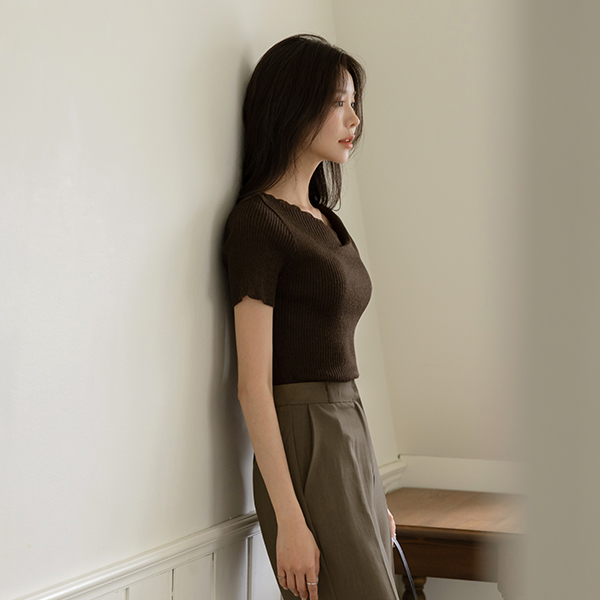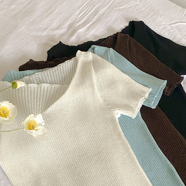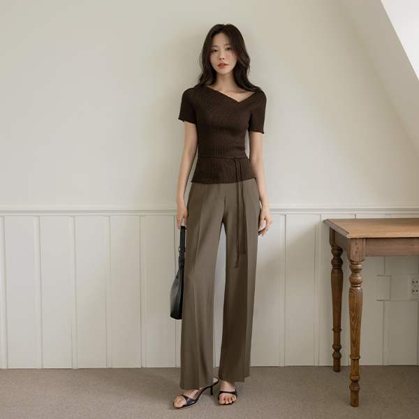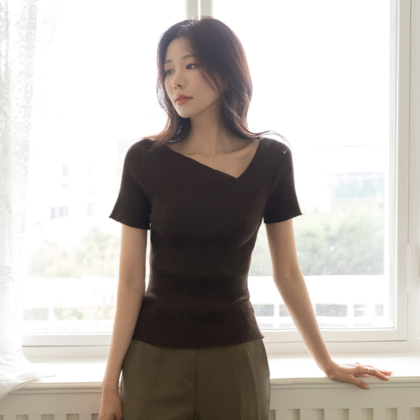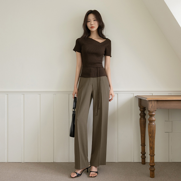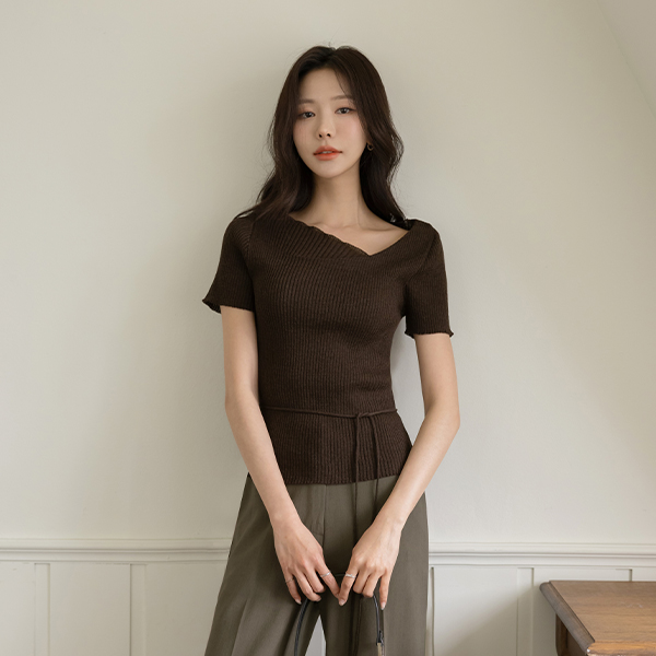 不对称 领口线 夏天 条绒 针织衫(+腰带)