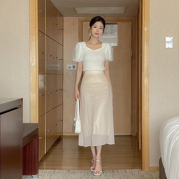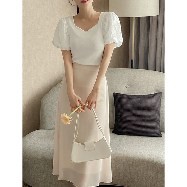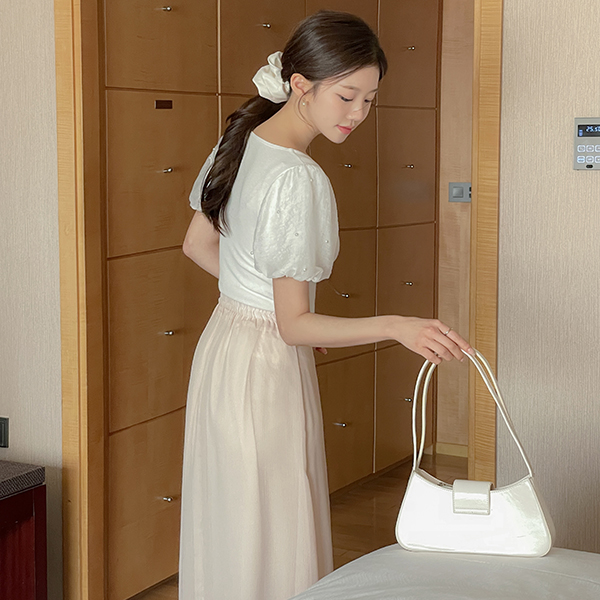 糖 泡泡袖 珍珠 오각넥 T恤衫