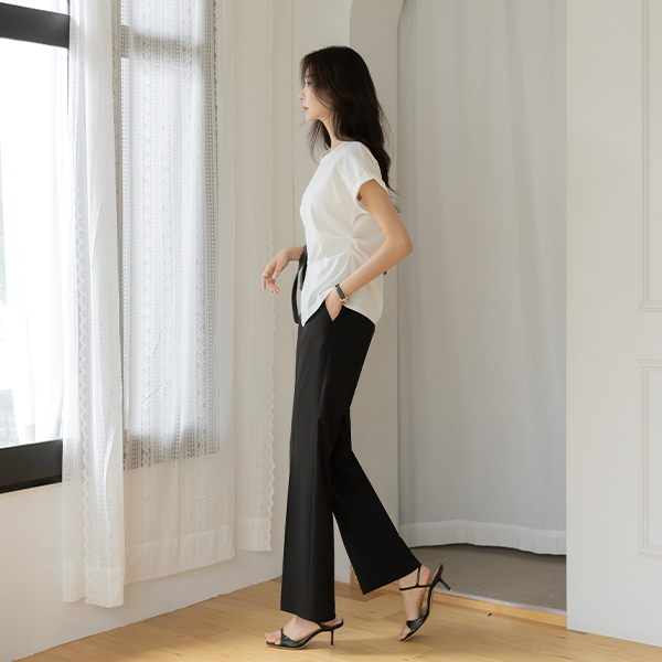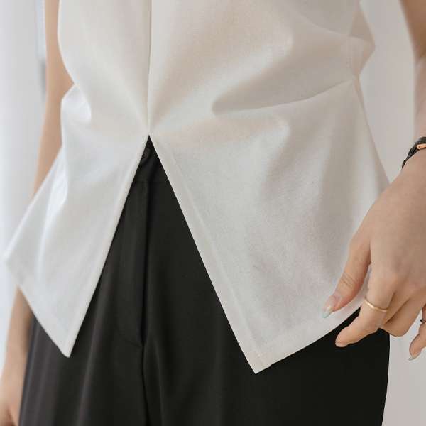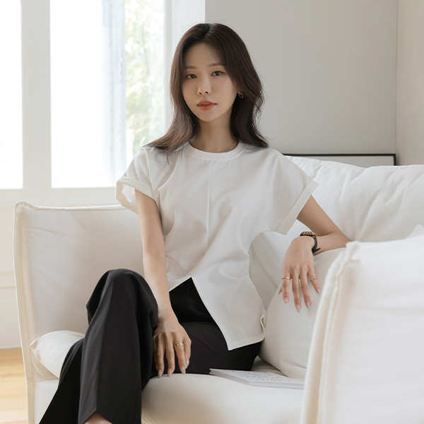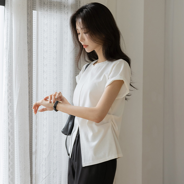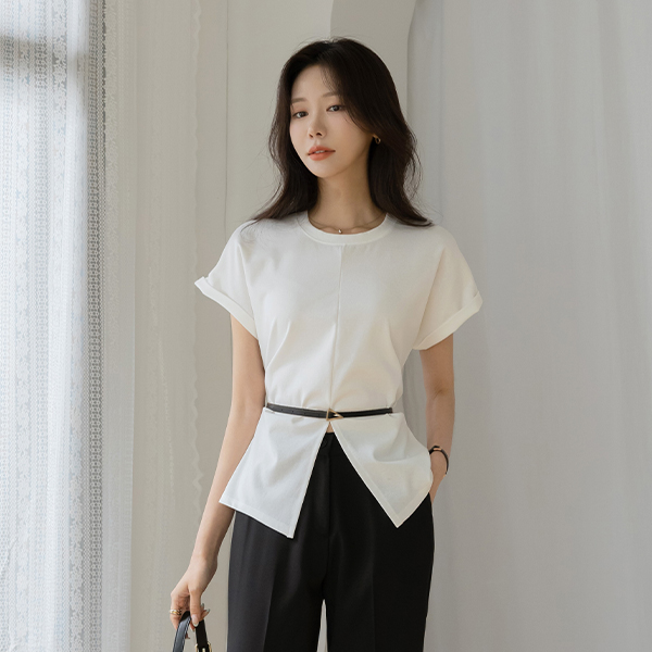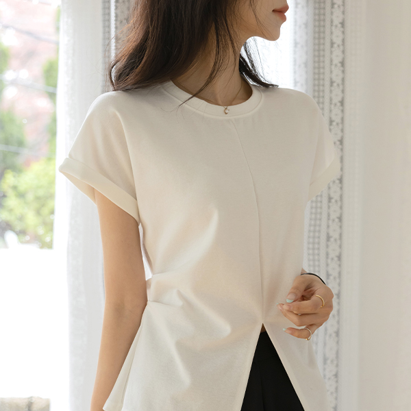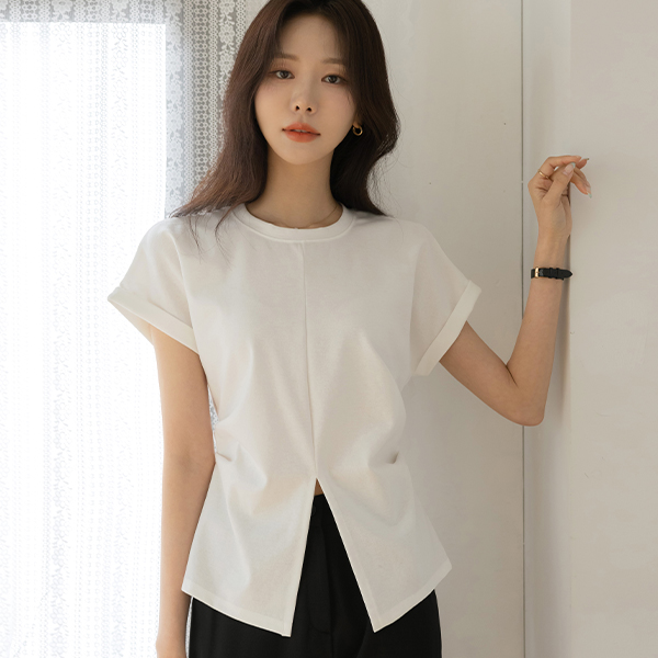 前面开叉 卷边 帽檐袖 褶皱 T恤衫