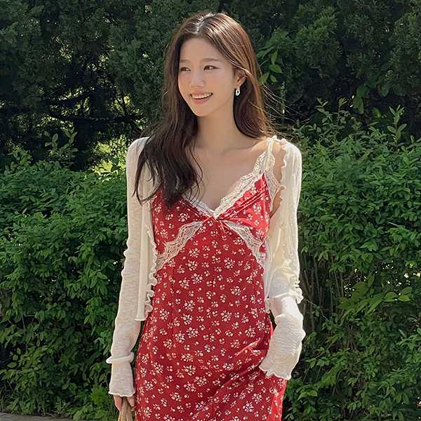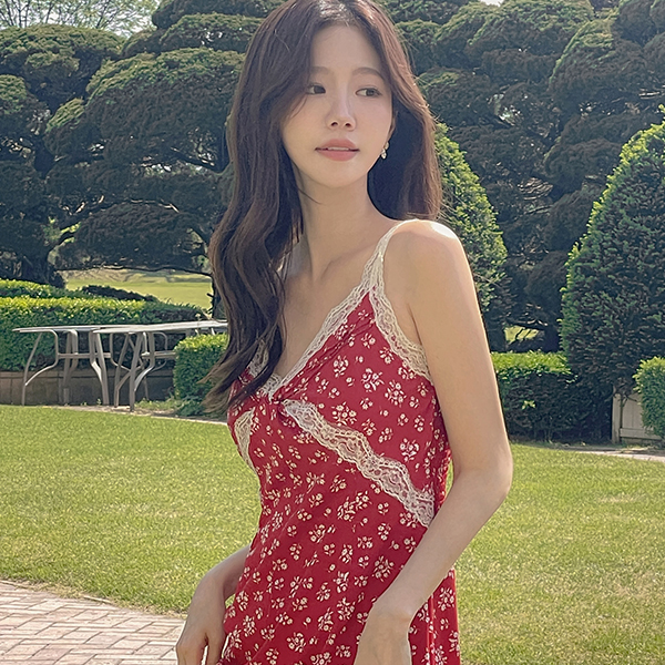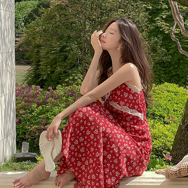 女性化的 碎花 蕾丝 后侧松紧带 背心 长款 连衣裙