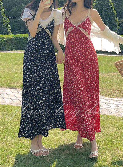 女性化的 碎花 蕾丝 后侧松紧带 背心 长款 连衣裙