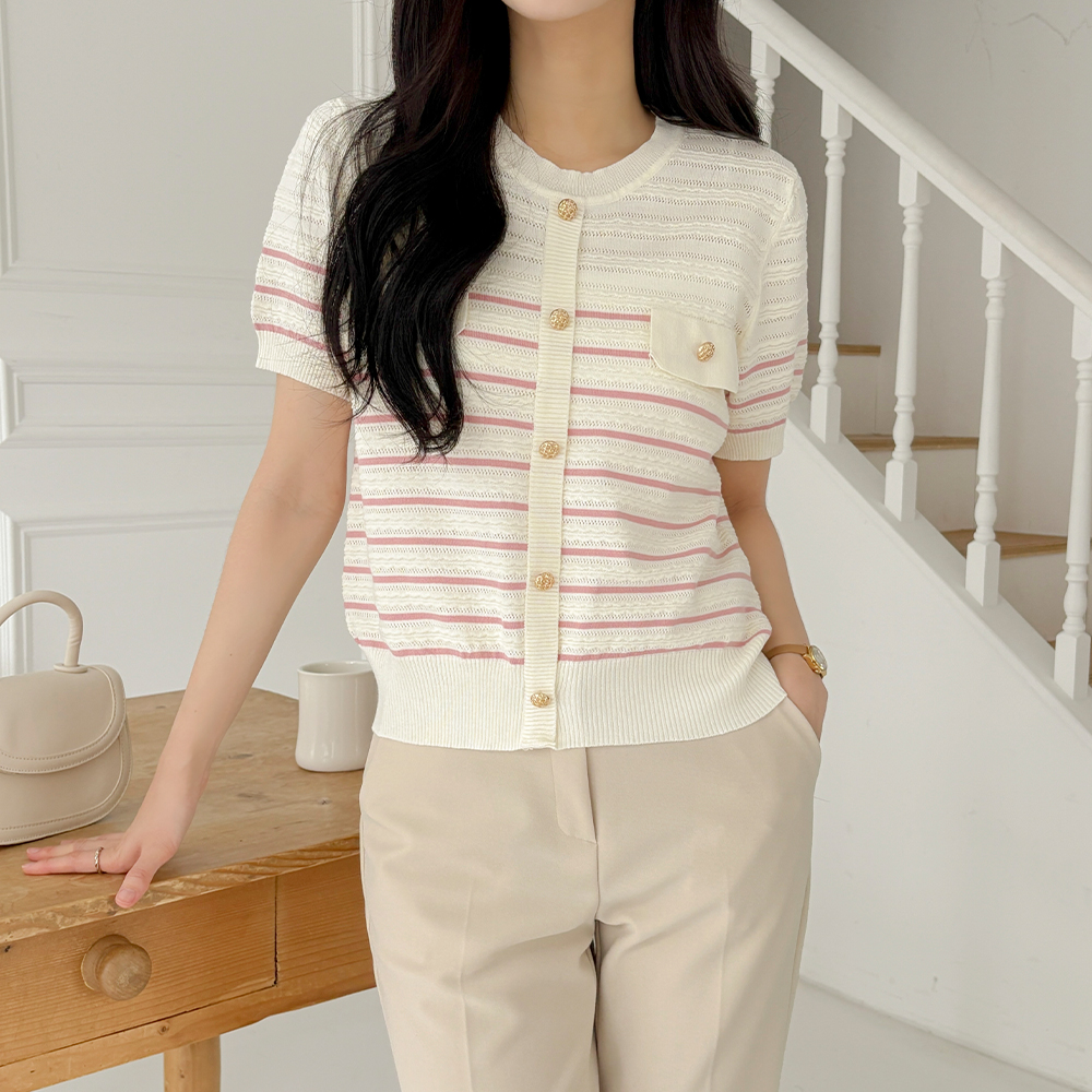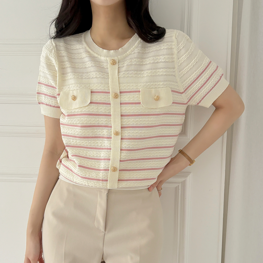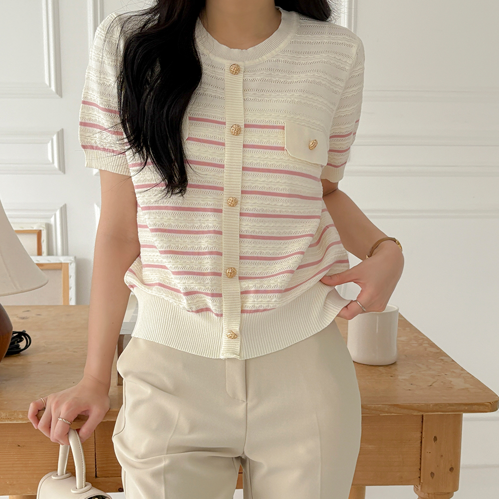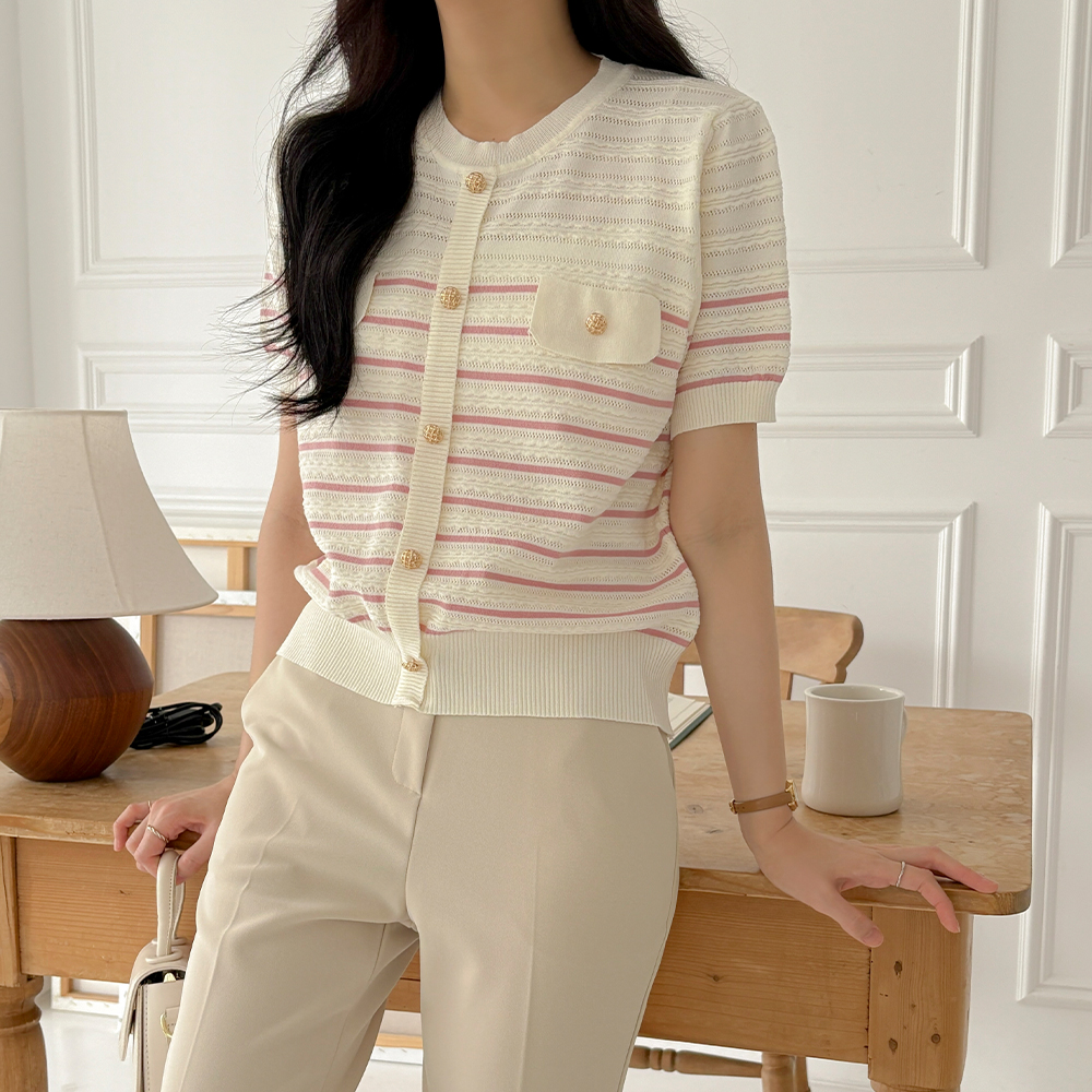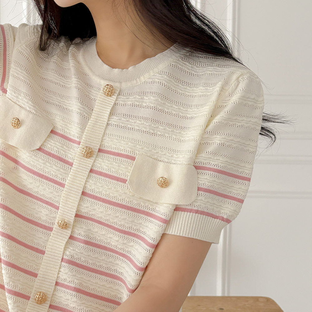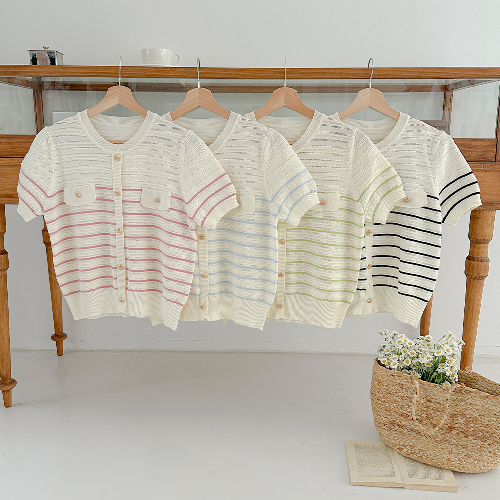 夏天 条纹 口袋 短袖 针织衫