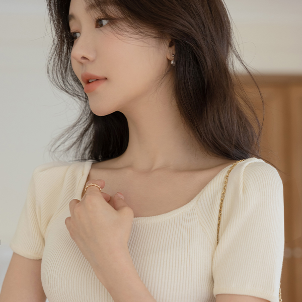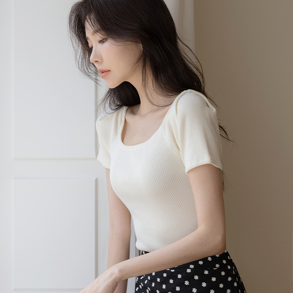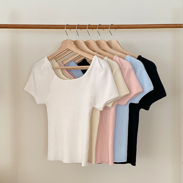 柔色 方领 泡泡袖 条绒 T恤衫