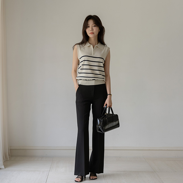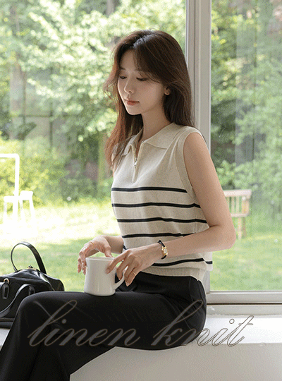 条纹 翻领 亚麻 背心 针织衫