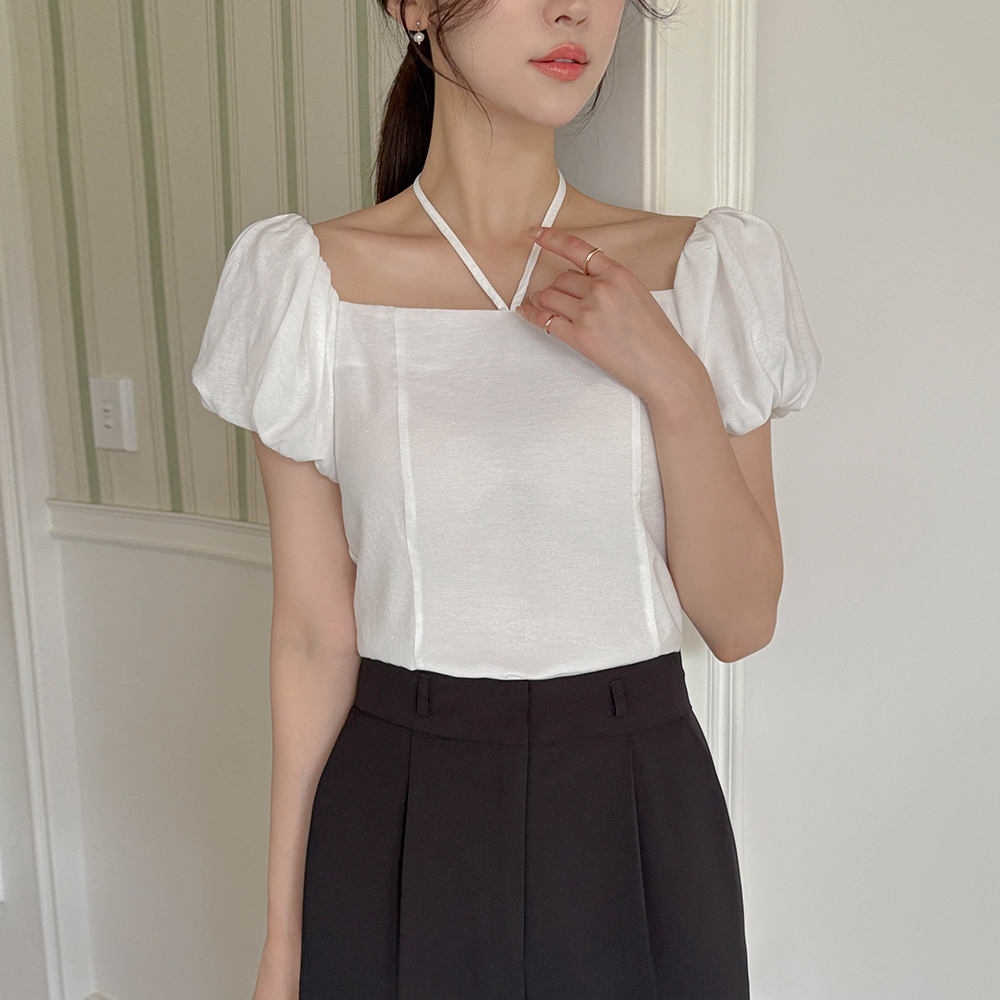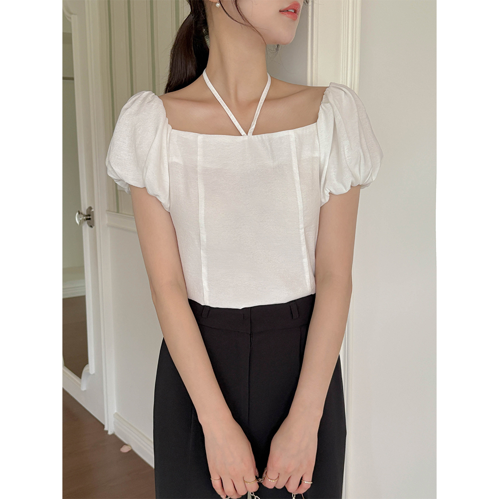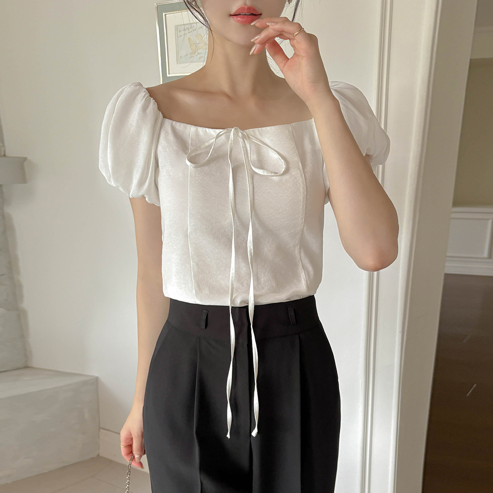 蝴蝶结带子 方领 泡泡袖 罩衫