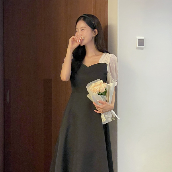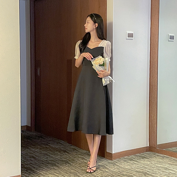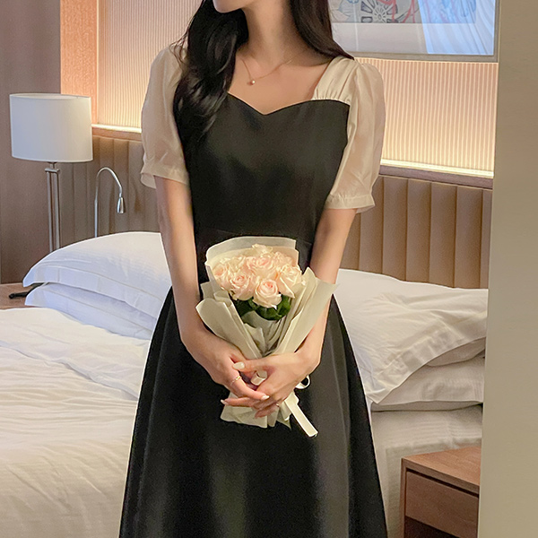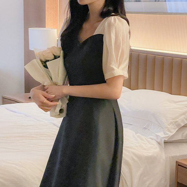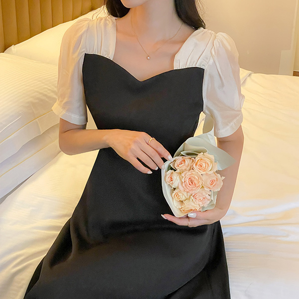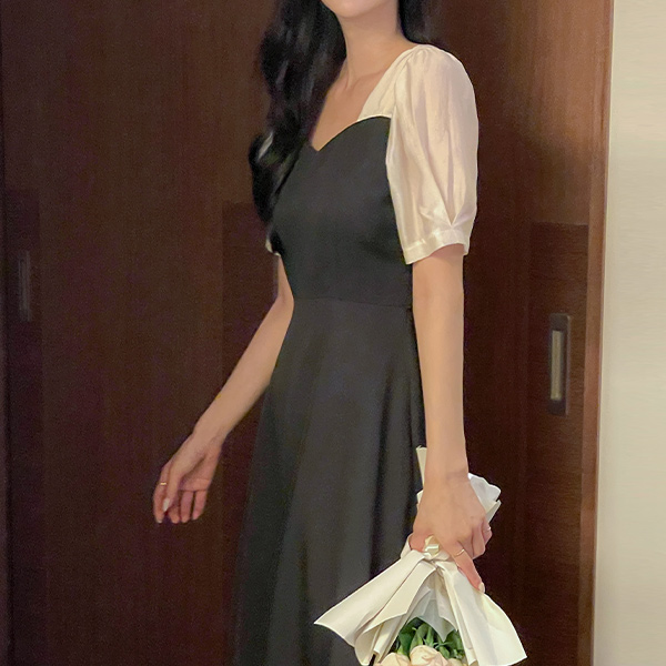 心形领 配色 A字型 连衣裙