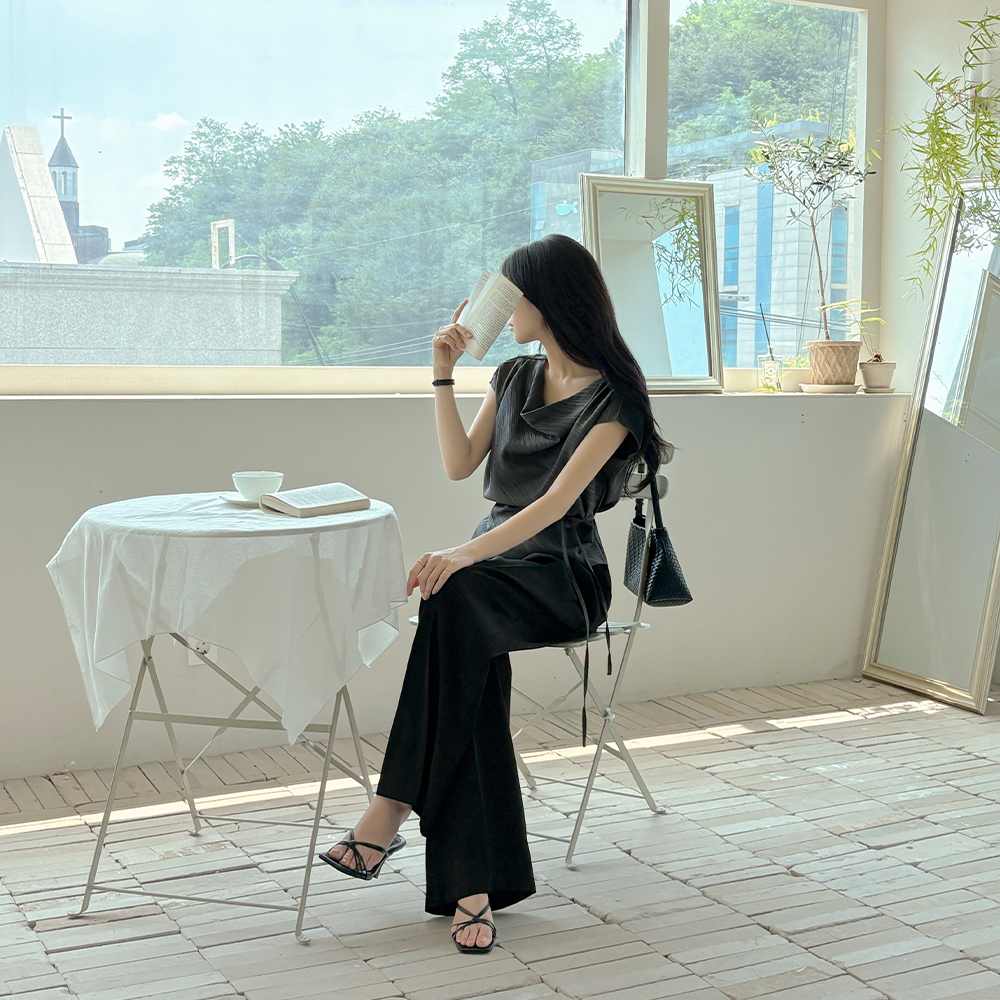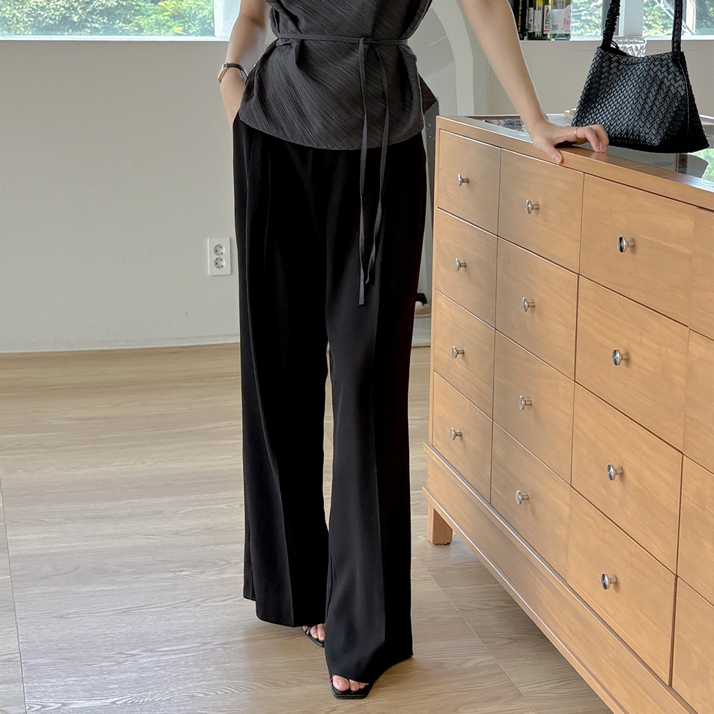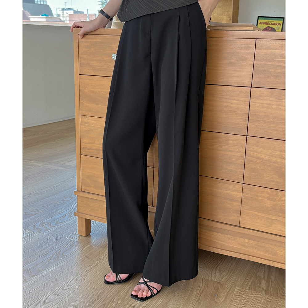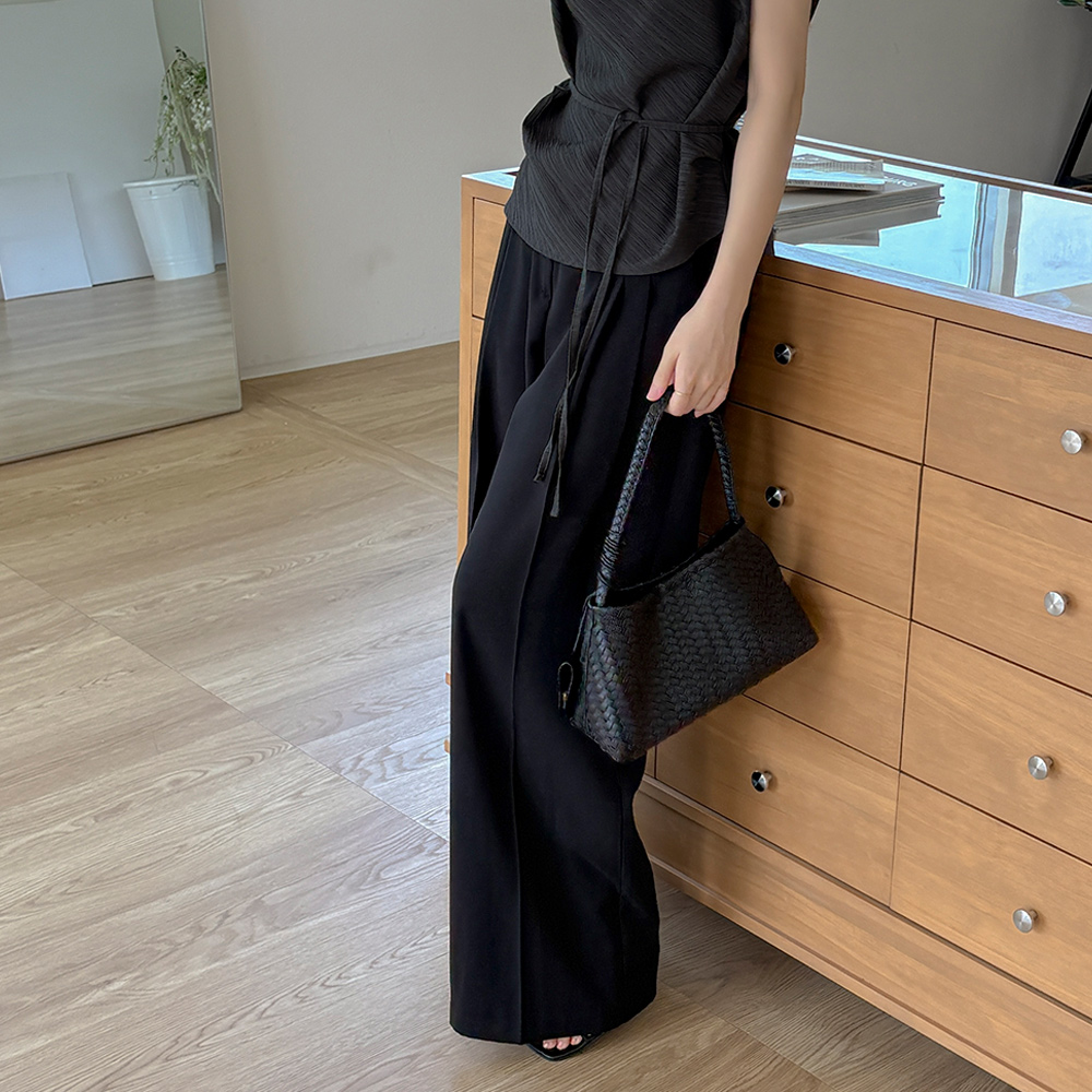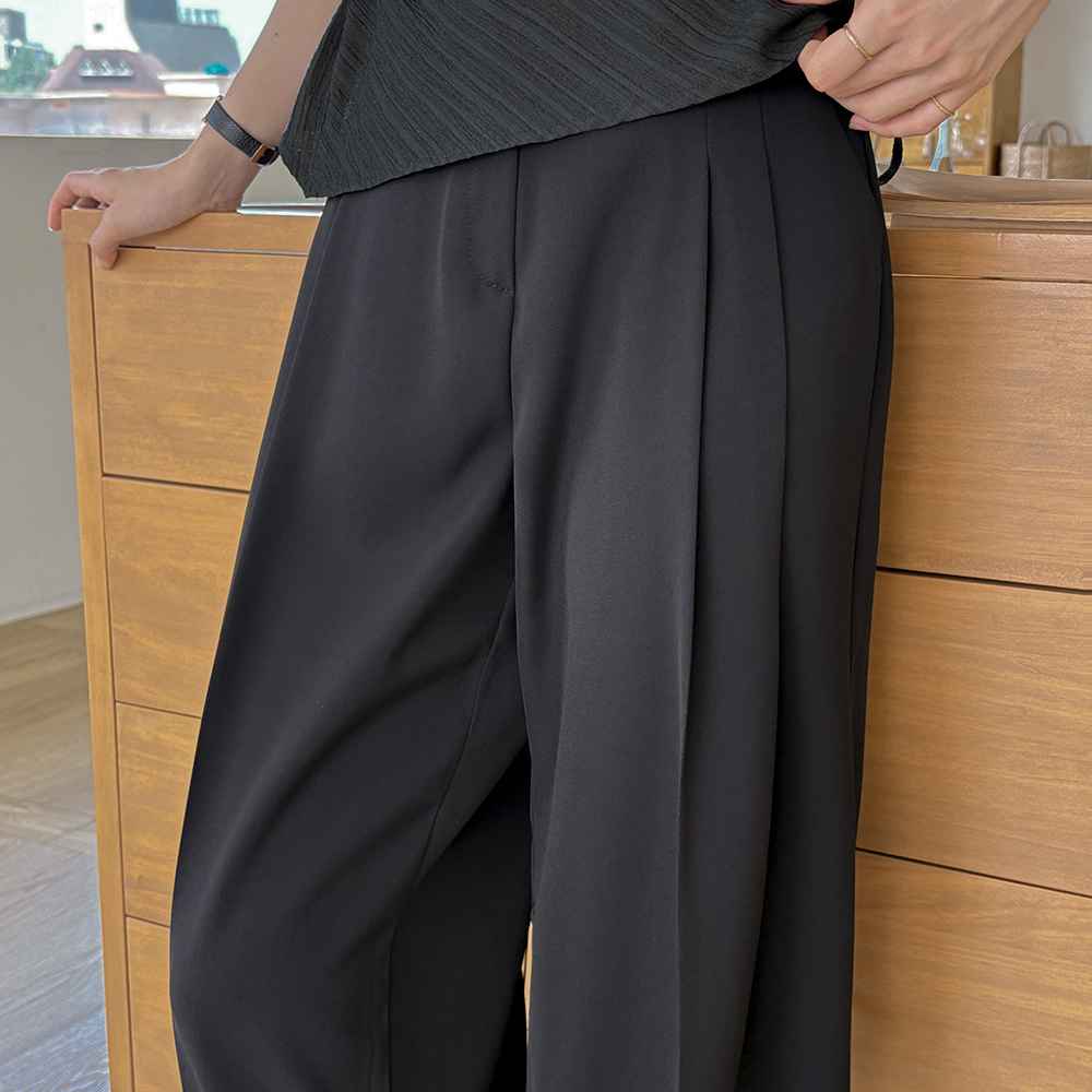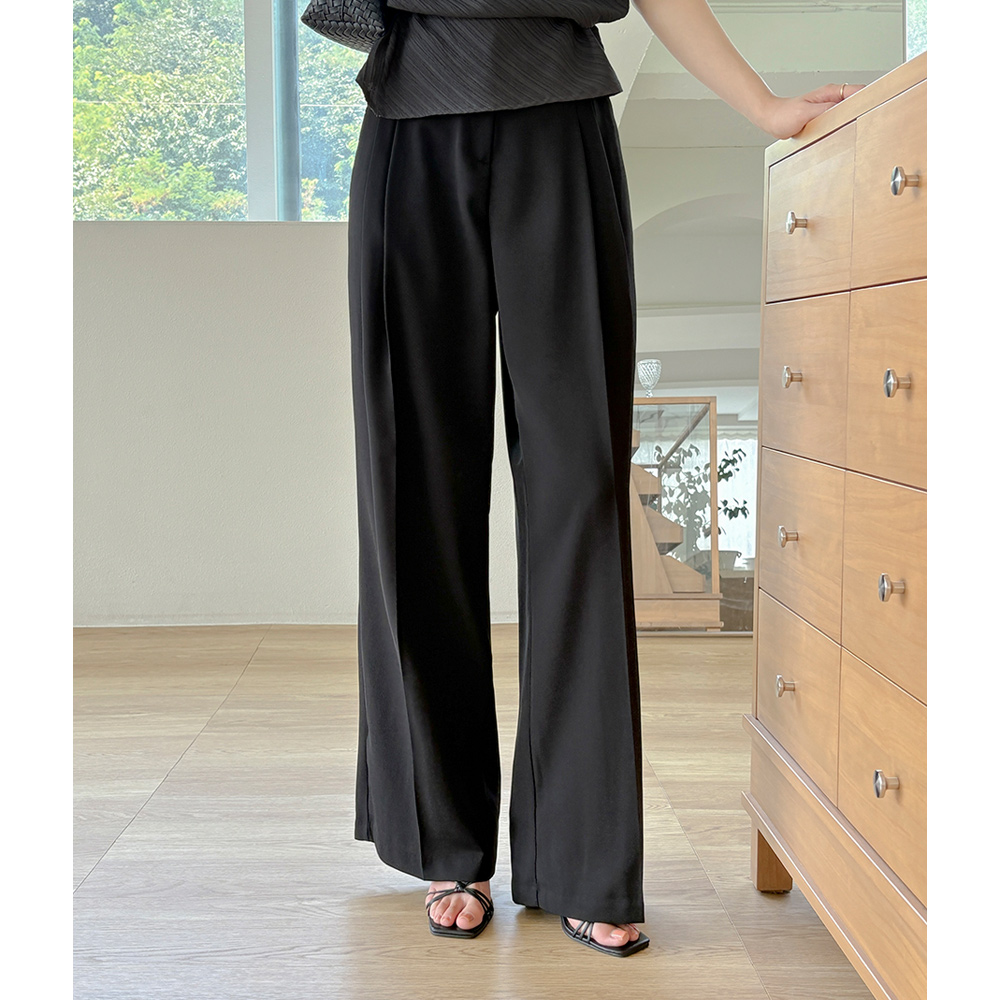 长腿 细褶 宽松 后侧松紧带 宽松长裤