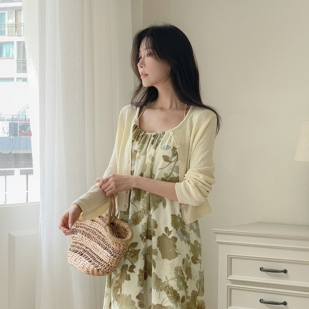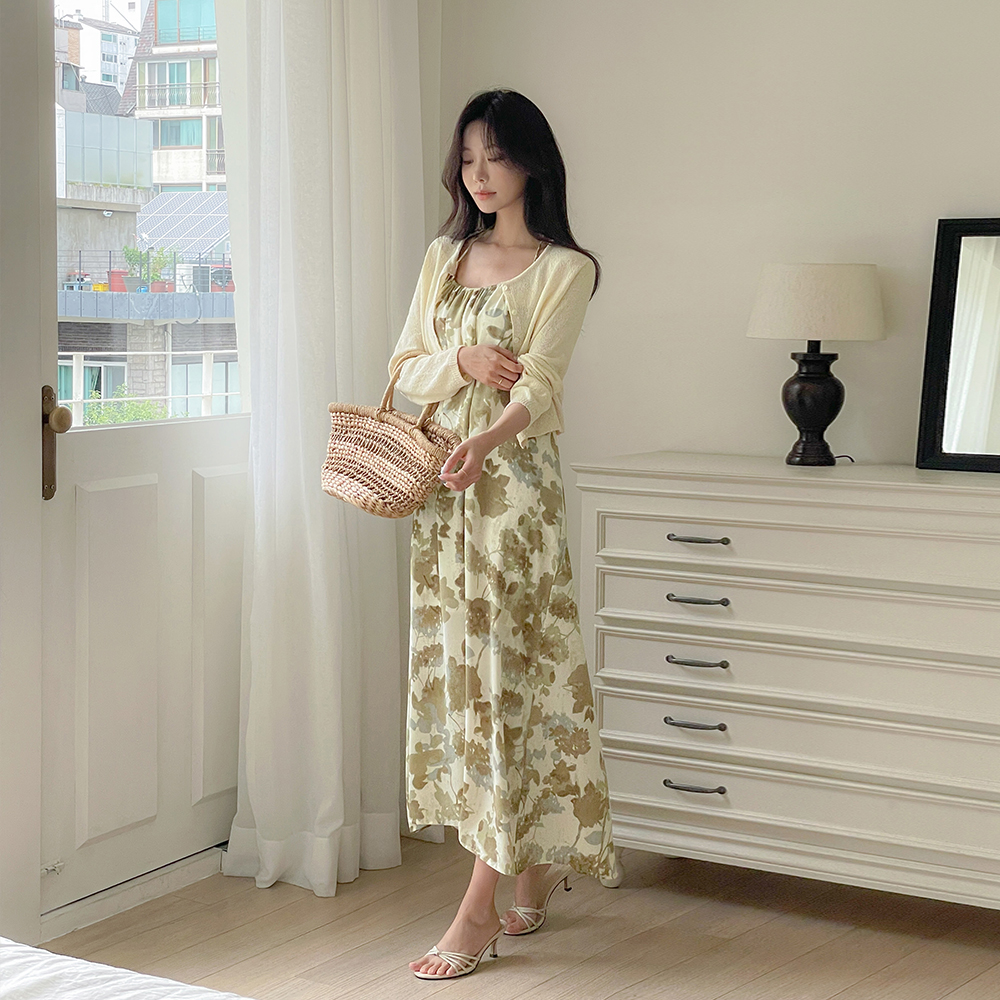 印染 袒肩露背领 鞋带 背心 连衣裙