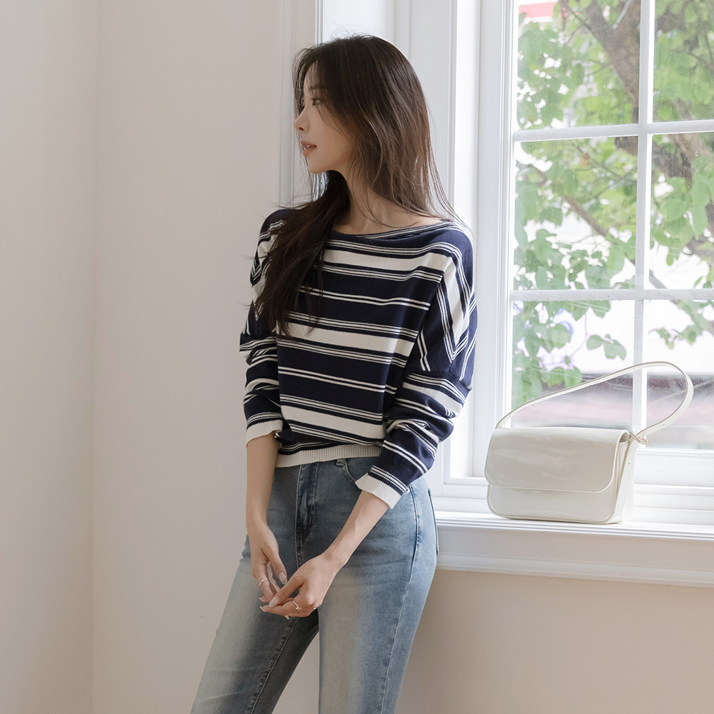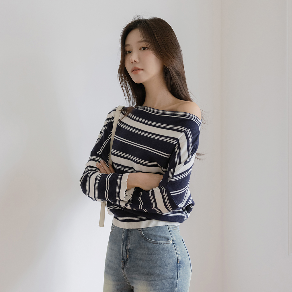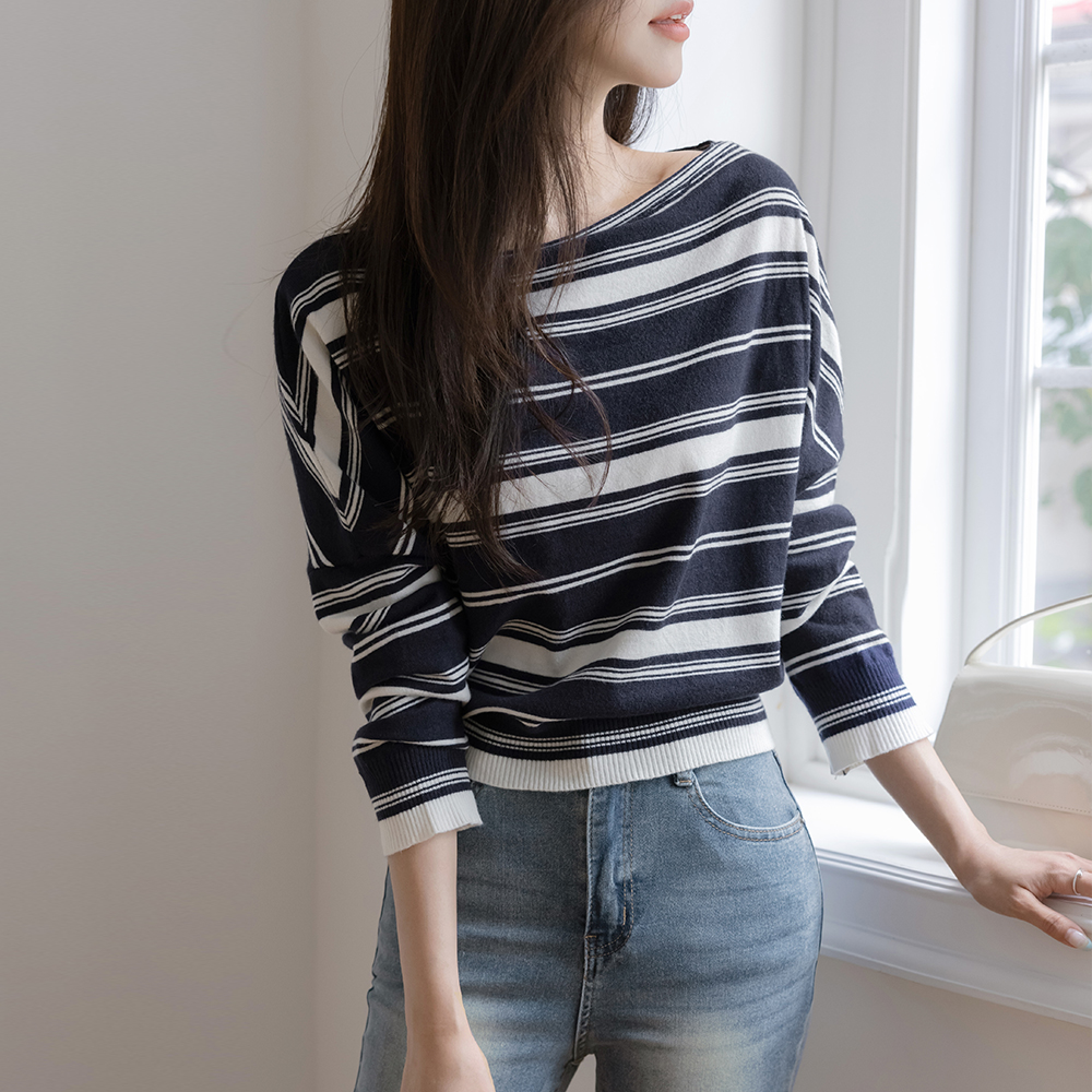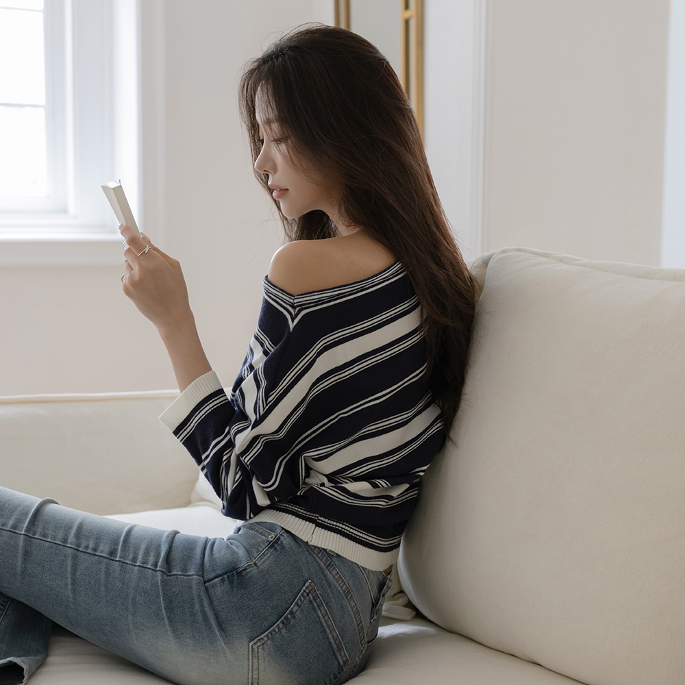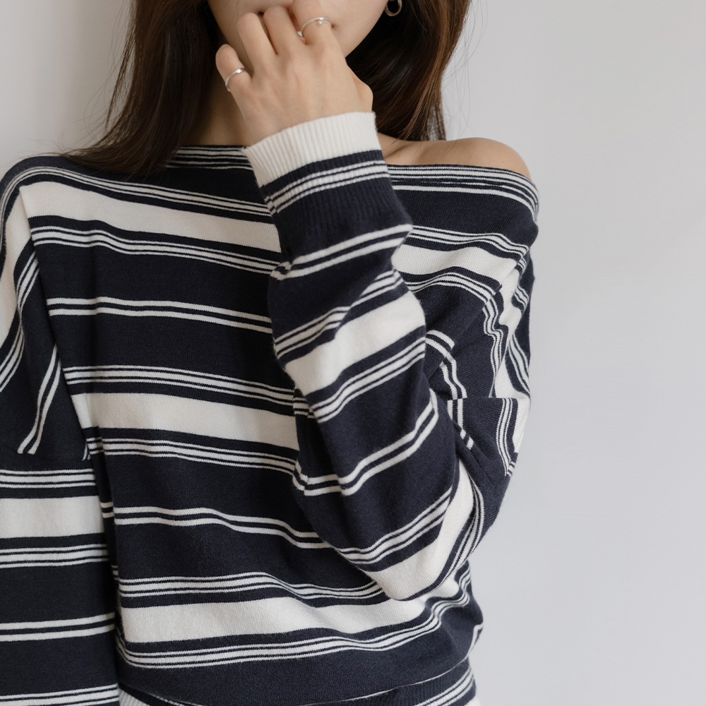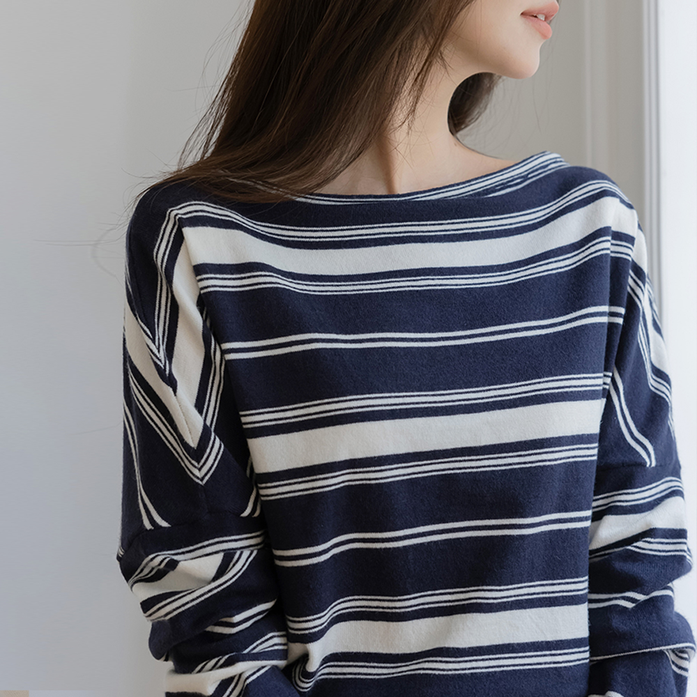 休闲的 嘴唇领 条纹 针织衫